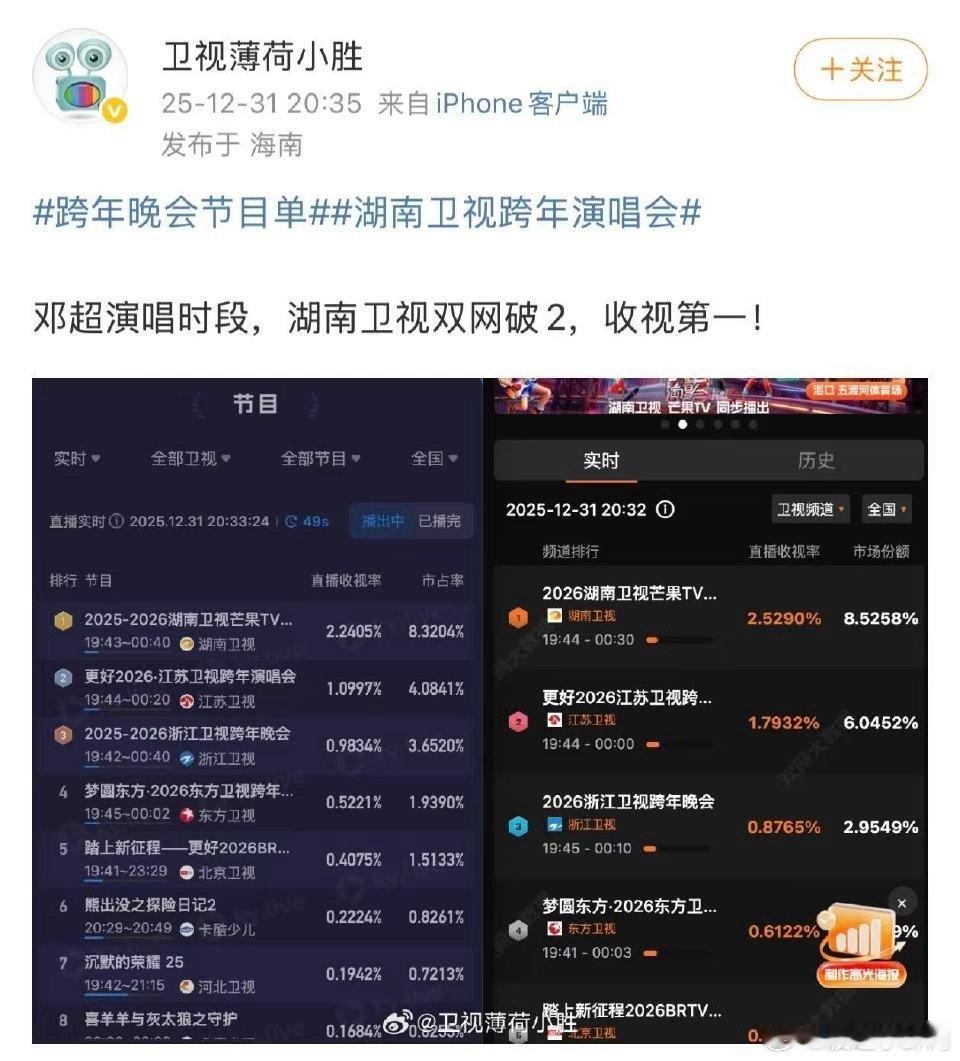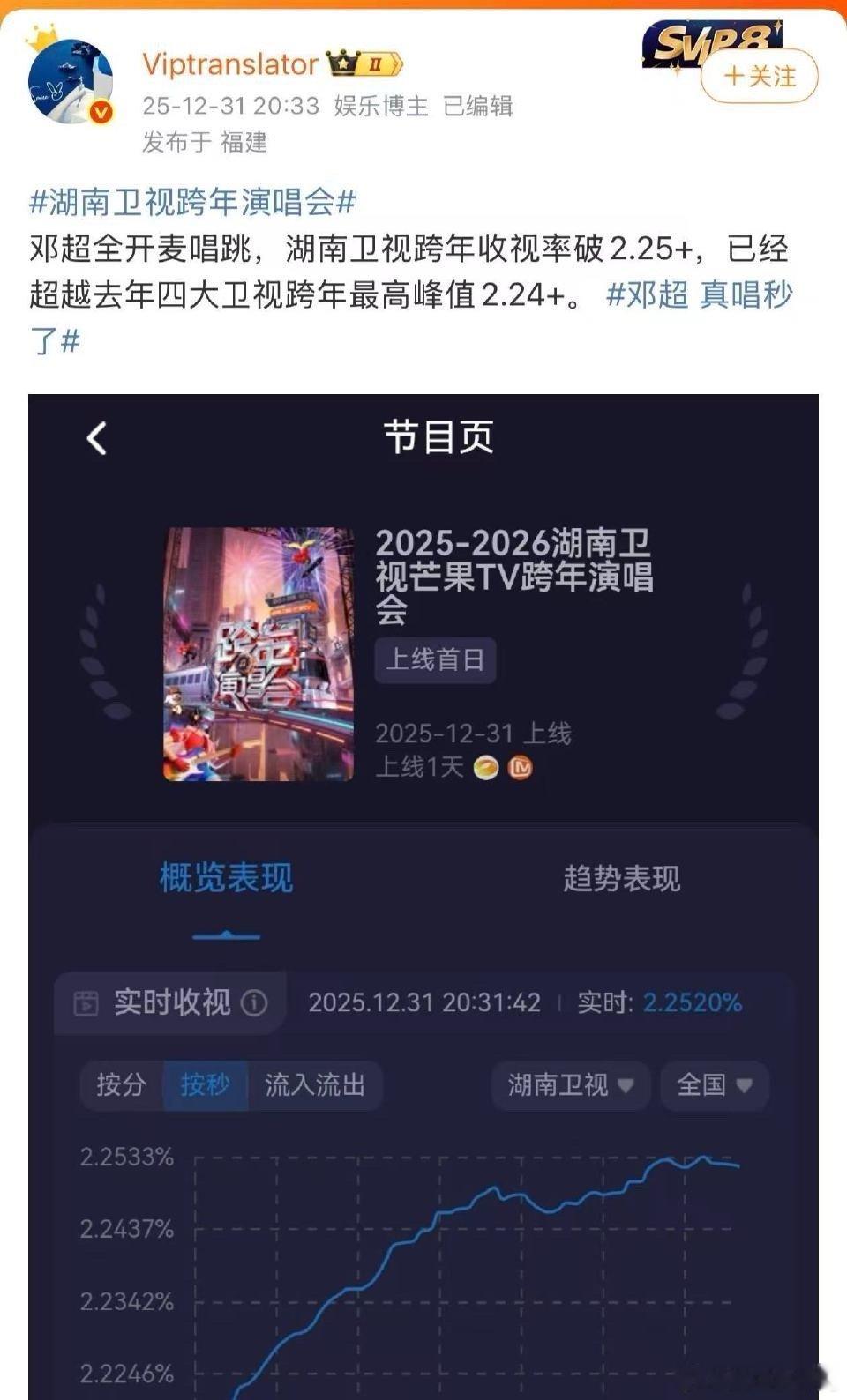 邓超一开口收视率就抬头邓超的权威根本不需要后知后觉好吗!!为舞台的提前身材管理,全开麦三首串烧,更是权威到没边了!!!现场嗨翻,线上更是收视率狂飙!!!直接打破去年跨年最高峰收视率深夜更是邓超一出来收视率就往上升真的不必解释,邓超的国民度真的不是开玩笑!个人魅力这一块邓超简直就是拿捏了