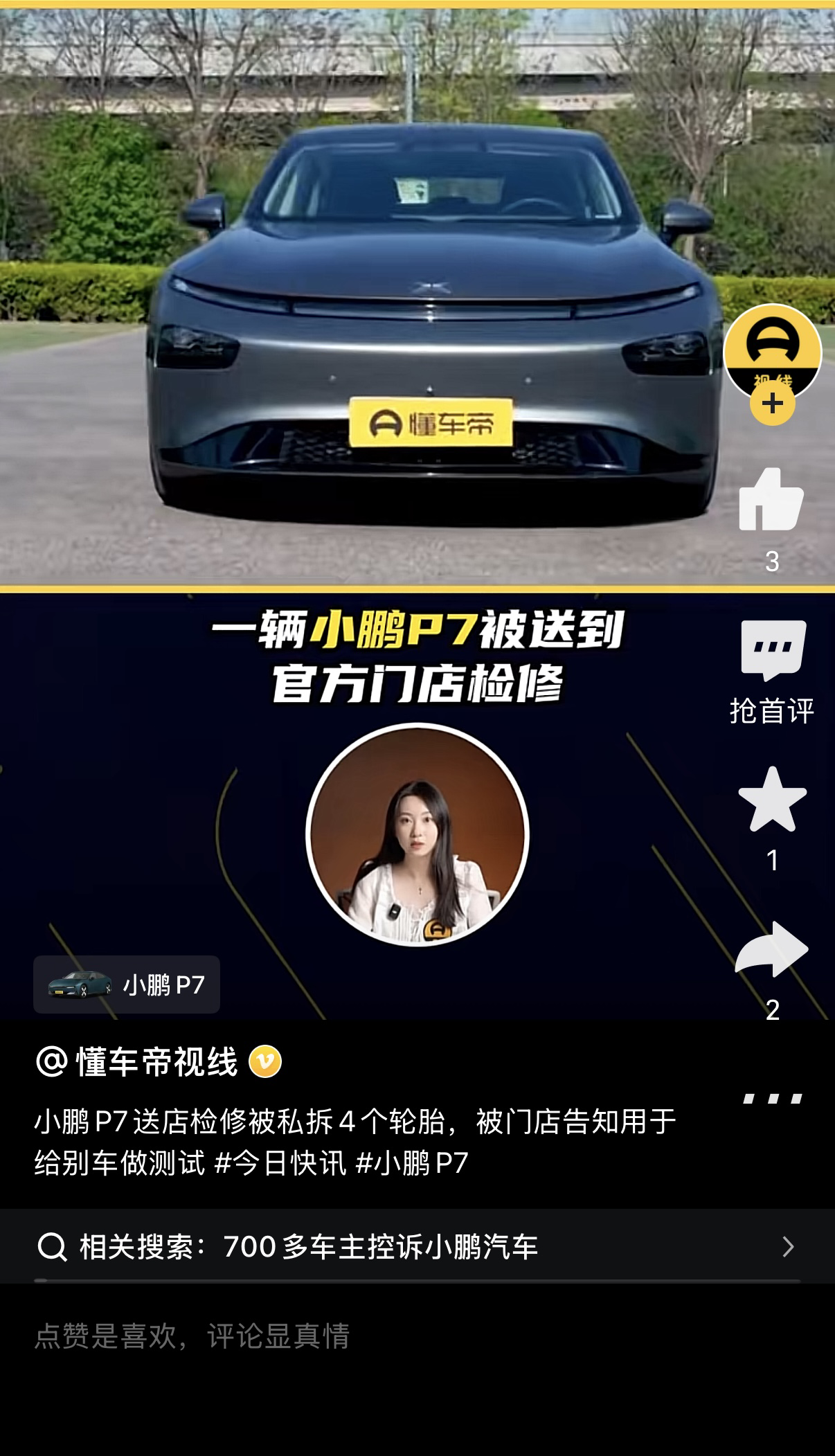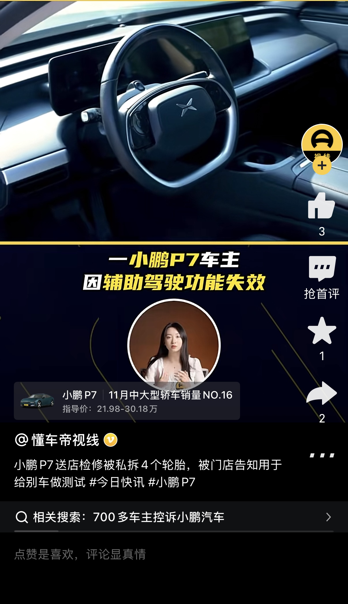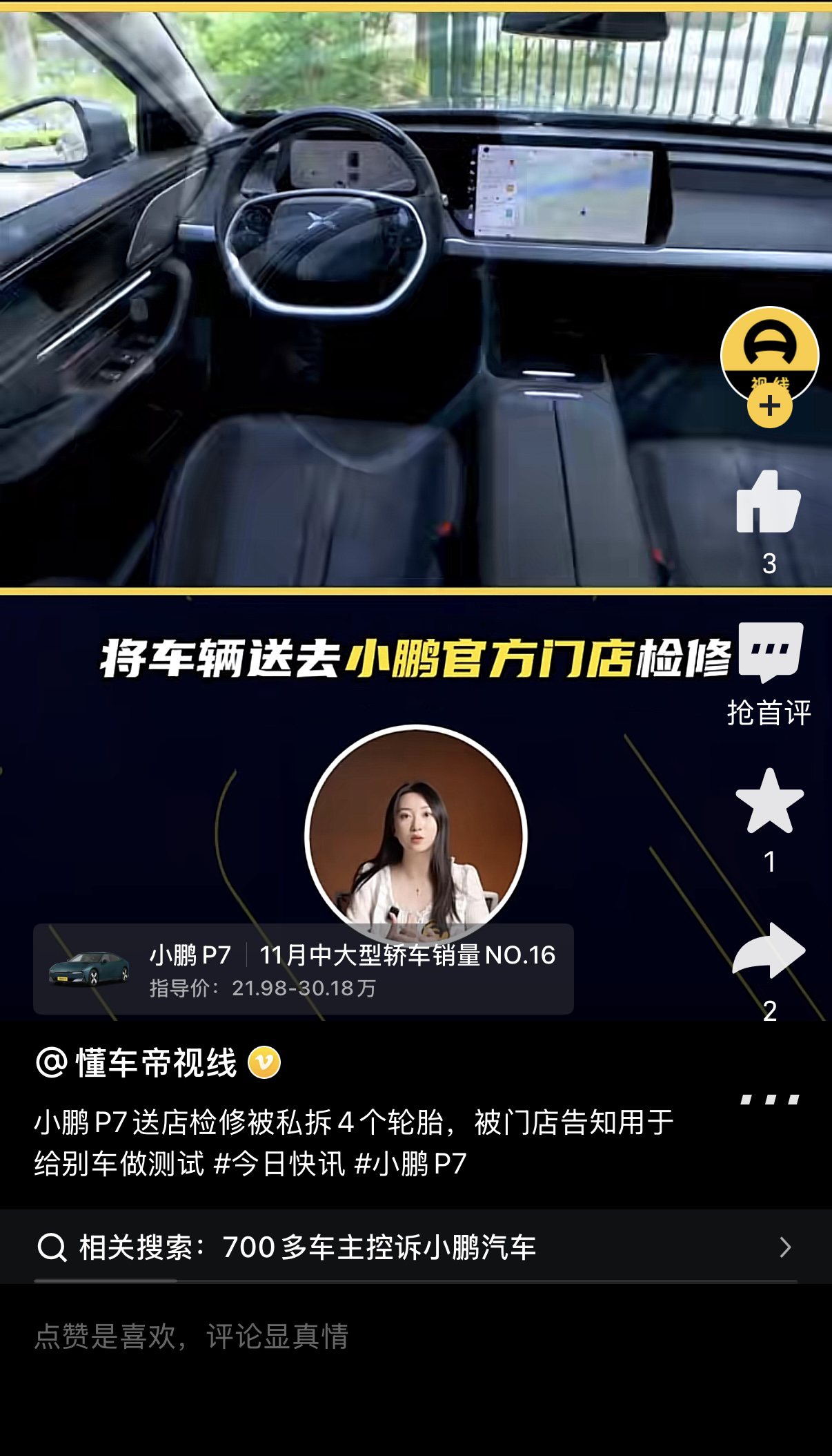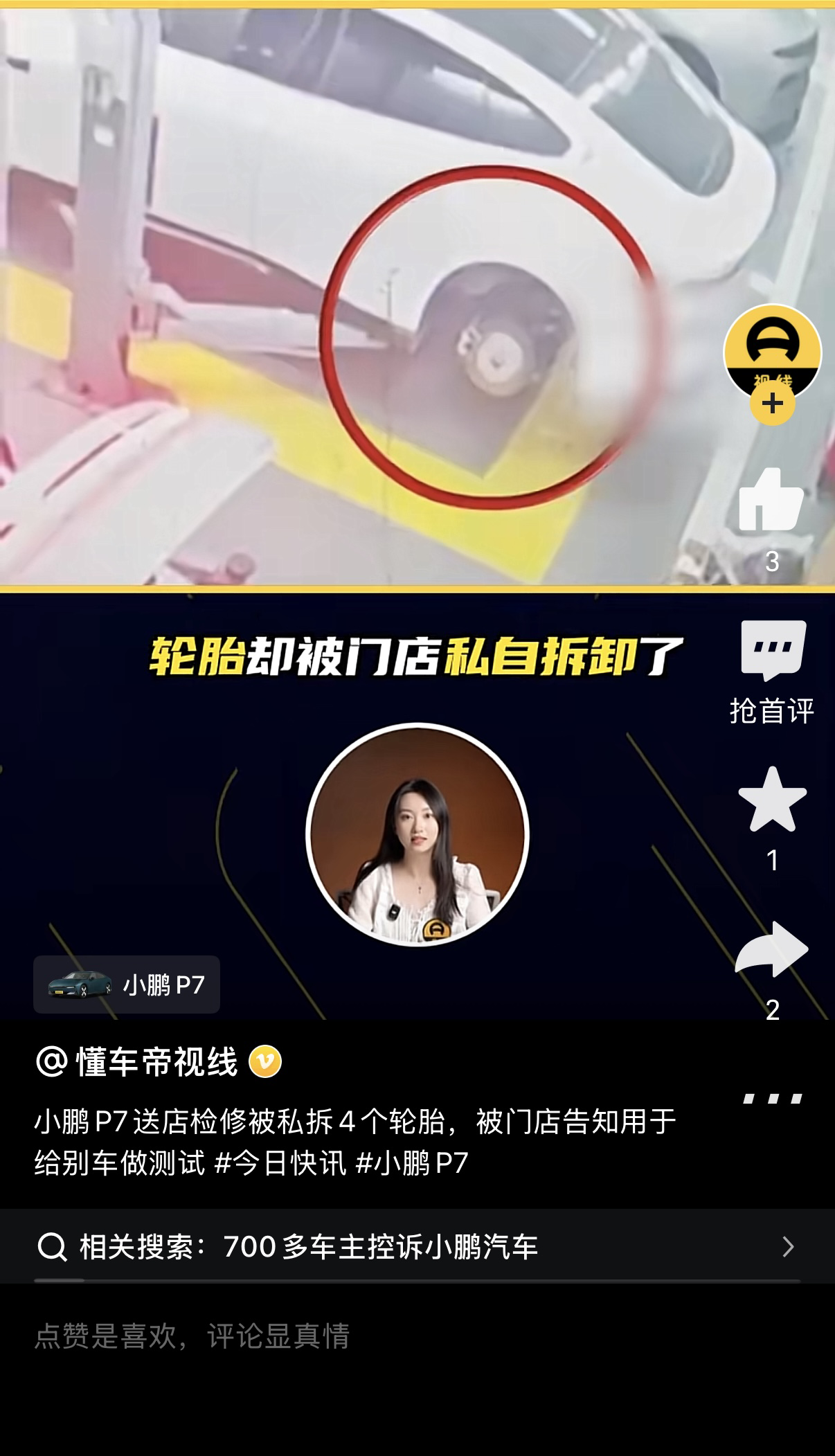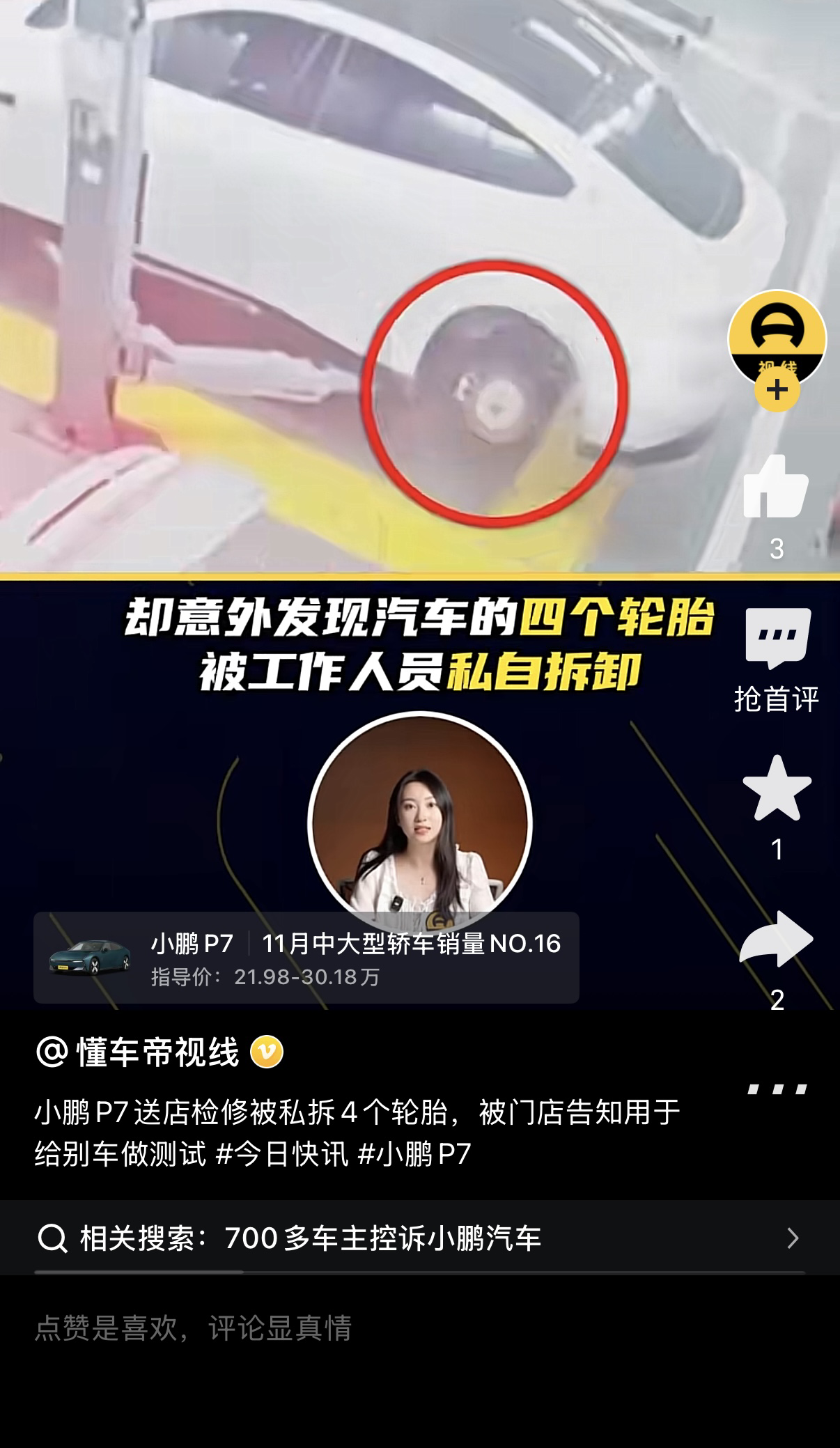 看到小鹏P7车主送修被私拆四个轮胎这事,我第一感觉就是特别离谱,也特别能理解车主的气愤。车主本来是因为辅助驾驶功能失效去官方门店检修,结果车子在自己不知情的情况下,轮胎被工作人员拆下来给别的车做测试,这首先就严重侵犯了车主的财产权和知情权。