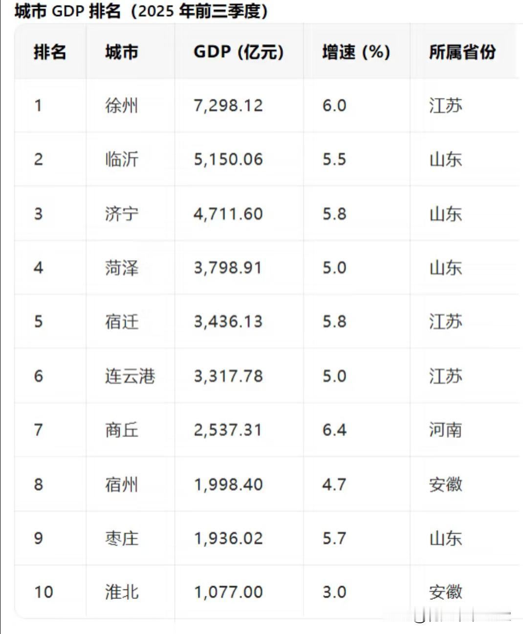 徐州“韧性”突破,苏北迎来首个万亿之城 2025年进入“万亿俱乐部”的3个城市各有特色,大连扛起了东北振兴的希望,温州坐稳了浙江第三极,而成功“撞线”的徐州,成为江苏第六座“万亿之城”,在苏南万亿城市形成集群效应之时,结束了苏北地区没有万亿GDP城市的历史。 作为曾经的“百年煤城”,徐州没有走“去工业化”的捷径,而是选择给传统产业做创新升级,同时让新兴产业“根壮叶茂”,形成了双轮驱动的格局。 工程机械作为徐州的“王牌”,2025年交出了产值突破4000亿元的成绩单,出口增速高达20%,17类主机产品拿下国内销量第一,夯实了“中国智造”标杆。 依托汉云工业互联网平台等本土服务商,2025年,徐州帮助255家创新型中小企业完成数字化改造,同步推动专精特新企业转型突破,解决了大量中小企业“不会转、不敢转”的难题。 其中,威拉里新材料从曾经的亏损企业,靠攻克3D打印模具钢粉等“卡脖子”技术,成长为国内规模领先的金属粉体供应商,同时入选省未来产业高成长性企业,这正是徐州传统工业向高端制造跃升的缩影。 2025年,徐州未来产业企业营收预计达316亿元,同比增长29%,331家关联企业集聚,15家入选省未来产业高成长性企业,“深地产业”入选全省首批未来产业先行集聚发展试点。 经开区的绿色低碳能源产业与工程机械形成“双主导”格局,构建起“2+3”现代产业体系。高新区的安全应急产业攻克150余项关键技术,7项产品入选全国推广案例,占全省40%,擦亮“中国安全谷”招牌。 作为淮海经济区中心城市,徐州的功能全面释放。 徐州的786公里干线铁路运营里程、390公里高铁里程,均位居江苏第一,构建起“通道+枢纽+网络”的立体交通体系,区位优势转化成实实在在的经济动能。 交通枢纽激活了消费市场。彭城广场中心商圈汇聚2800余家商贸企业,辐射半径拓展到150公里,市外居民消费占比超30%,相当于每三块钱消费里就有一块来自周边城市。2025年1-10月,徐州社会消费品零售总额同比增长6.2%,增幅领跑全省。 文旅消费同样亮眼,全年汉文化景区游客量突破千万,文旅消费规模稳居全省第三,曾经的历史底蕴变成了消费增量。