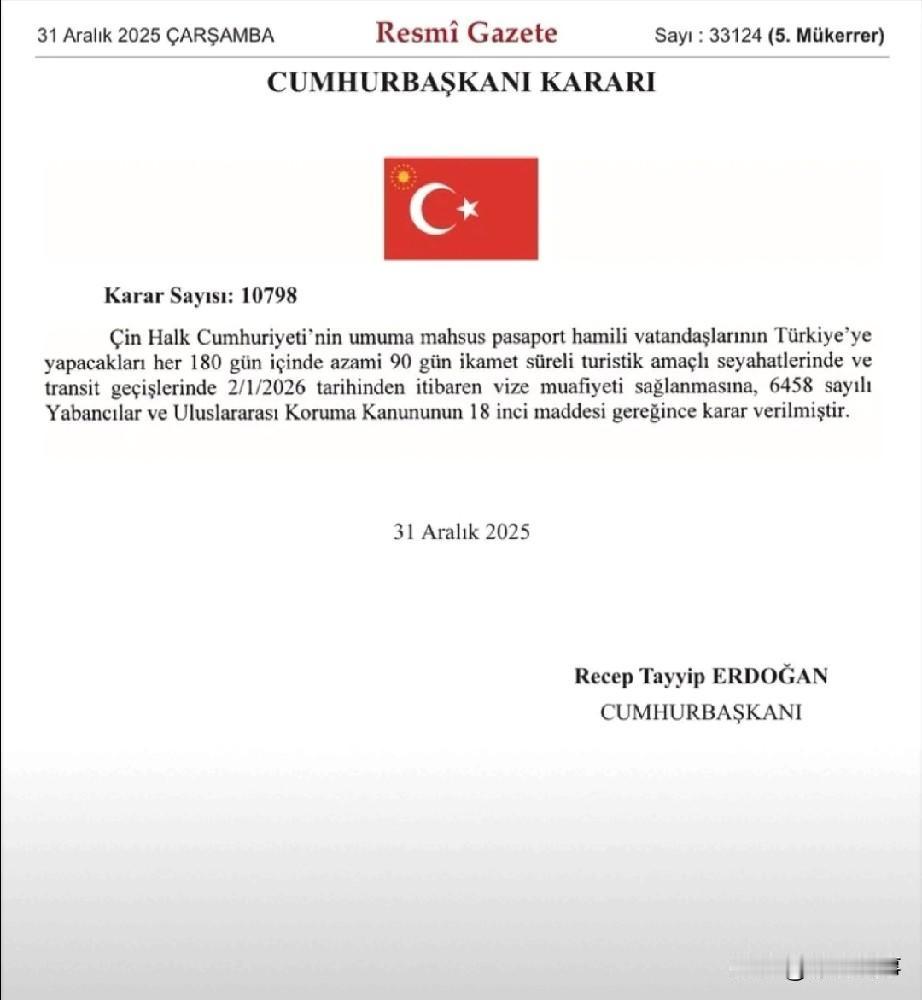 2025年最后一天深夜,土耳其出台重磅政策:埃尔多安签署总统令,2026年1月2日起,中国普通护照公民赴土免签,每180天可停留90天。 土耳其此举有三层考量。一是抢抓中国游客分流机遇,中日关系变化带动游客流向调整,多国争相吸引中国游客,土耳其2024年接待外国游客5263万人次,中国游客仅40.97万,占比0.78%,市场开发空间巨大。 二是为中土建交55周年铺路,两国曾因涉疆问题多年未实现国事访问,免签政策为2026年双边高层互动创造条件,中方或推出对等措施,便利两国人文交流。 三是平衡双边经贸关系,2024年中土贸易中,中国出口381亿美元、进口37亿美元,土耳其存在较大逆差,扩大旅游服务贸易出口可有效缓解这一问题。 此次免签是两国人文交流的突破,彰显土耳其深化对华合作的意愿,推动“一带一路”与“中间走廊”战略对接,助力全球南方国家协作,推动全球治理体系朝着公正合理方向发展。