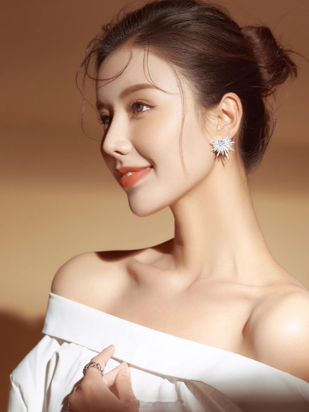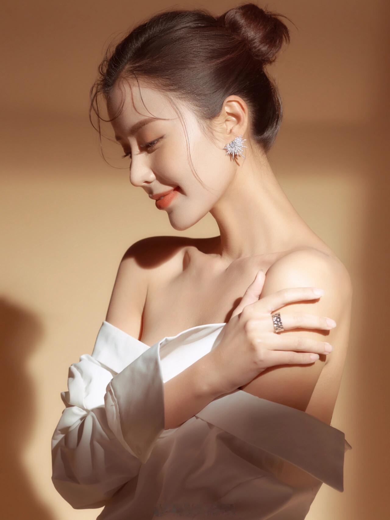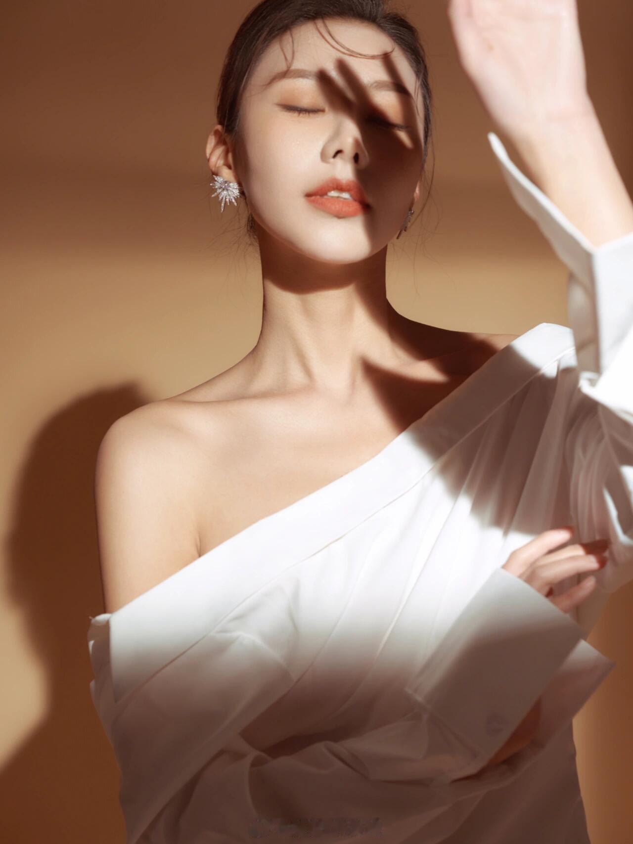 暖调光影裁开柔白衣袂,指尖轻扬拢住一束光,睫羽垂落的瞬间,鎏金轮廓吻上肩颈,清冷