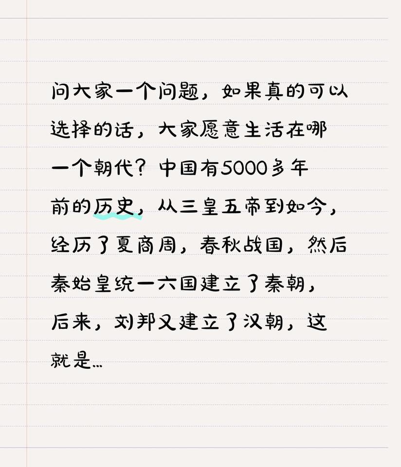问大家一个问题,如果真的可以选择的话,大家愿意生活在哪一个朝代? 中国有5000多年前的历史,从三皇五帝到如今,经历了夏商周,春秋战国,然后秦始皇统一六国建立了秦朝,后来,刘邦又建立了汉朝,这就是历史上的西汉,再后来,西汉灭亡,刘秀又建立了东汉,东汉灭亡以后,又出现了魏蜀吴三国鼎立的局面,然后又进入了魏晋南北朝时期,最后又有了唐宋元明清。 在这么多的朝代里面,如果让大家任选一个朝代的话,大家会选择在哪个朝代生活呢?