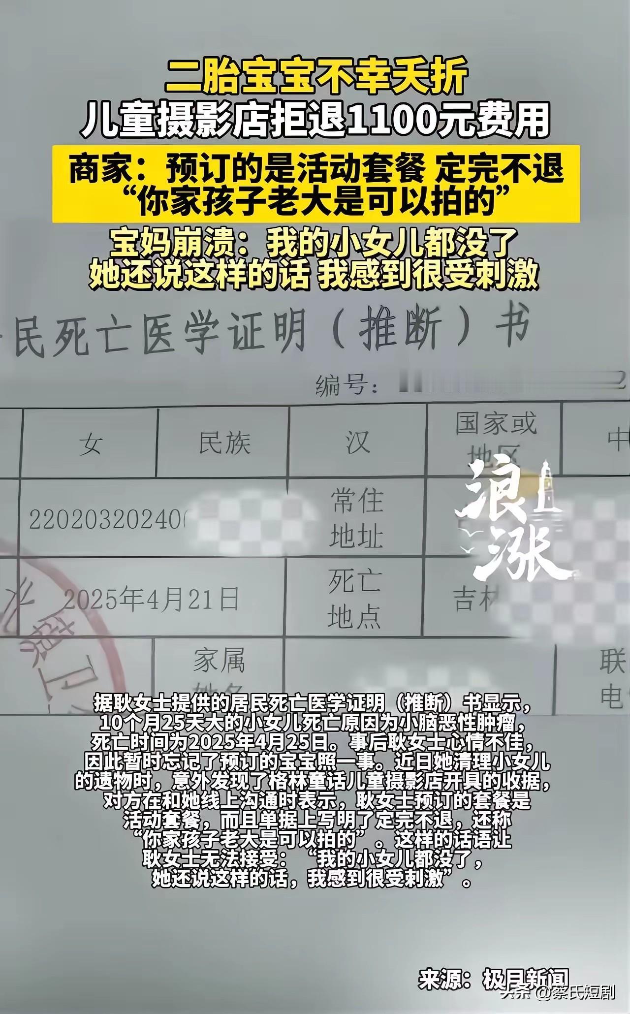 在生命的无常面前,我们常常会感受到无力与无助。尤其是在失去亲人的那一刻,任何言语都显得苍白无力。近日,一则关于一位母亲因二胎宝宝夭折而与摄影商家发生冲突的事件,引发了社会广泛的关注与同情。这不仅仅是一场商业纠纷,更是一场关于人性、关怀与尊重的深刻反思。 事件的起因很简单:这位母亲在怀孕期间,为即将出生的二胎宝宝预订了一套摄影套餐,花费了1100元。然而,不幸的是,二胎宝宝在出生后不久夭折了。悲痛之余,母亲决定退掉这份摄影套餐,试图减轻一些经济负担,也希望借此缓解心中的痛楚。然而,商家却以“不能退费”为由,拒绝了她的请求,并且用冷漠甚至带有不敏感的言辞回应:“你二女儿没了,可以留着给你家老大拍!” 这句话如同一把锋利的刀子,刺痛了母亲的心。她崩溃哭诉:“我的小女儿都没了,她还说这样的话,我感到很受刺激!”这段话中,满是无助与愤怒,也折射出商家缺乏应有的人性关怀。 在现代社会,商业交易应当建立在公平、诚信和尊重的基础上。面对客户的特殊情况,尤其是涉及家庭悲剧时,更应展现出应有的同情心与理解。而商家的冷漠回应,不仅让人质疑其职业道德,更让人感受到一种冷酷无情的社会现象。 这起事件引发的思考,不仅仅是关于退款的问题,更是关于我们社会的价值观。每个人在面对突如其来的变故时,最需要的不是冷漠的回应,而是理解与关怀。尤其是在母亲失去孩子的悲痛中,一个温暖的安慰可能比任何金钱都更有价值。 同时,这也提醒商家和服务行业的从业者,面对客户的特殊需求和情感诉求时,应当多一些人文关怀。商业不是冷冰冰的交易,而是人与人之间的互动与信任。一个善意的态度,可能会让悲痛中的人感受到一丝温暖,也能体现企业的良知与责任。 对于这位母亲来说,她失去了最珍贵的宝贝,心如刀绞。她的哭泣,是对生命的哀悼,也是对社会冷漠的一种控诉。我们应当反思:在面对他人的痛苦时,我们是否还能保持一份善良与同情?是否能在利益与人性之间做出正确的选择? 这起事件也提醒我们,法律和道德的底线不应被忽视。消费者权益保护法明确规定,消费者在特殊情况下有权请求合理的退换货。商家应当以人性化的方式处理突发事件,而不是用冷漠和不合理的理由拒绝。 在未来的社会中,我们更希望看到的是一种关怀与理解的文化。当有人遭遇不幸时,社会的每一个角落都应充满温暖。每一份善意的回应,都能成为受伤者心中的一束光,帮助他们走出阴影,重新站起来。 最后,愿这位母亲早日走出悲痛,愿逝去的孩子安息,也希望社会各界能从中汲取教训,让我们的社会变得更加温暖和有爱。每一个生命都值得尊重,每一次关怀都能带来希望。让我们共同努力,营造一个充满善意与理解的世界,让悲伤不再被冷漠淹没,让爱与温暖永远伴随每一个需要的人。