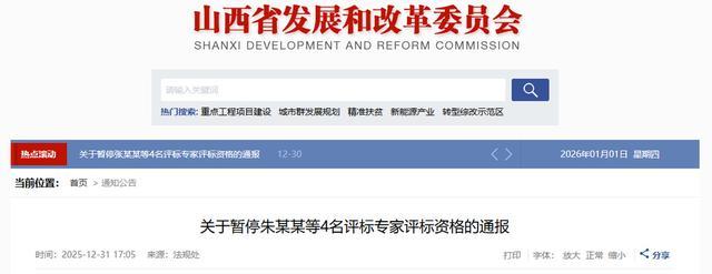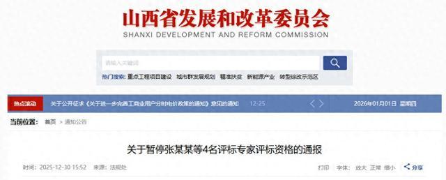 2025年12月30日至31日,山西省发展和改革委员会连续发布两则暂停评标专家评标资格的通报,共对8名来自省评标专家库的专家作出6个月内禁止参加依法必须进行招标项目评标的处罚。