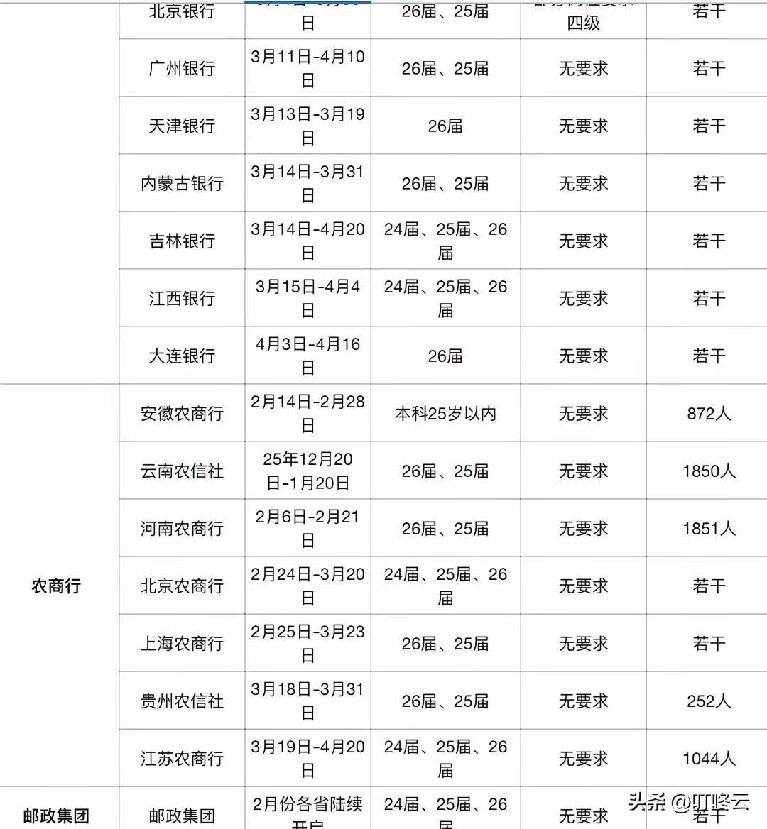 28家!全国银行系统春招报名时间汇总合集!一图概览,国有6大银行+12大股份制银行+各地农商银行!收藏起来备用,报名时间窗口集中在2026.2.7~4.30日!希望未来在银行系统发展的同学们,速速围观揭秘详细内容!机会总是留给有准备的人![点亮平安灯][点亮平安灯][烟花][烟花] 欢迎关注@叮咚云 将优先为粉丝职业规划指导,1对1咨询是付费服务,为你定制最适合的就业择业方案!欢迎留言交流讨论。[来看我][来看我] 免责声明:图片来自网络,仅供参考! 央国企求职条件 央国企求职 央国企招聘 央国企求职就业 央国企秋招 在银行工作,什么岗位最好?银行秋招校招 银行春招报名