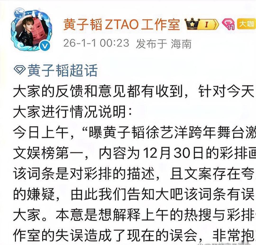 黄子韬工作室因“激吻”事件道歉,背后隐藏了怎样的信任危机? 黄子韬工作室近日因“激吻”事件引发粉丝和公众热议,最终不得不发表道歉声明。据消息,1月1日凌晨,工作室称误以为热搜词条“曝黄子韬徐艺洋跨年舞台激吻”仅描述12月30日彩排画面,导致澄清与事实不符,造成误会。此次事件不仅暴露了工作室信息核实失误,更引发粉丝对夫妻捆绑营销的不满。黄子韬工作室的道歉未能平息粉丝怒火,粉丝认为工作室将粉丝当作“控评工具人”,信任因此破裂。舆论普遍认为,信任崩塌只需一次敷衍,而艺人团队应更加注重专业性和透明度。