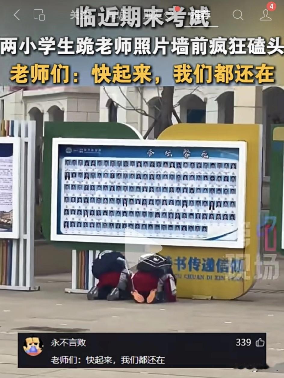 期末考临近,小学生组团拜老师照片墙:百万点赞背后,到底是童真还是“考试拜神”? 期末考前的学校老师照片墙,画风突然变得有点“虔诚”。 12月31日,贵州某小学,两个小身影“扑通”一声跪在教师风采墙前,有模有样地磕起了头。动作整齐划一,态度认真得像在完成某种神秘仪式——这一幕被拍成3秒视频,瞬间引爆网络,收获百万点赞。 评论区瞬间吵成两派,可爱 VS 离谱: 🍒“萌派”网友觉得无可厚非: “孩子就是觉得好玩,拜一拜心里踏实!” “总比考前哭鼻子强,这是把老师当神仙拜了哈哈哈。” “传统礼仪嘛,说明孩子心里有老师。” “在做题与作弊之间,选择了作法!” “把老师当老祖宗使了!” 🍒“忧派”网友眉头紧皱: “尊师重道非得用跪拜?平时好好听课才是真尊重。” “这哪是尊师,分明是考前临时抱佛脚,把老师当‘分数菩萨’了。” “小小年纪就学会‘迷信式努力’,谁灌输的?” 只是这看似搞笑的行为,背后可能是孩子把考试看得太重了。 期末压力下,一些孩子潜意识里把“考好”和“集体荣誉”、“爸妈开心”、“自己是不是好孩子”紧紧绑在一起。 当感觉自己“学不完”“考不好”时,就会寻找各种心理寄托——拜老师照片,本质上和拜考神、转发锦鲤没什么区别。 “这不是简单的童真,而是压力之下的一种情感出口。”专家提醒,如果学校和家长只当笑话看,不去关注孩子背后的焦虑,类似的“行为艺术”可能还会升级。 这事儿给所有家长提了个醒: 👉别把“考不好就完了”挂嘴边——你说者无心,孩子听者有意,可能真觉得考砸是天大的事。 👉平时多肯定孩子的努力,而不是只盯着分数。让孩子知道,他的价值不止一张试卷。 👉如果孩子真去拜了,先别急着批评或嘲笑。可以开玩笑问:“拜完是不是心里踏实点?但其实你认真复习的样子,比拜什么都管用。” 尊师重道,从来不是磕出来的头,而是课堂专注的眼神、见面真诚的问候、毕业后还能记得老师说过的话。 期末考试只是学习路上一个小站,不是人生审判。比起在照片墙前跪拜,我们更希望看到孩子们在遇到难题时,能勇敢举手:“老师,这题我还是没懂,您能再讲讲吗?” 毕竟,老师不是神,但他们真的能帮你解开那道题——这可比拜照片实在多了。 教育无小事,每一个看似搞笑的行为,都值得大人温柔解读。 素材来源:第一现场,侵联删!