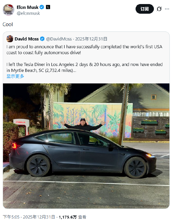 特斯拉人工智能软件副总裁阿肖克・埃卢斯瓦米也在X上发文称:“这是全球首次借助特斯拉自动驾驶v14版本完成的全程自动驾驶横跨美洲大陆之旅。恭喜并感谢@戴维斯・莫斯!”