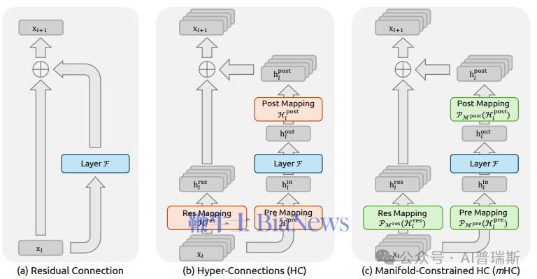 简单来说,mHC并不是完全推翻原有结构,而是给超连接增设一道“约束”,将原本自由度极高的连接矩阵,限制在一个数学层面更加稳定的“流形空间”中。