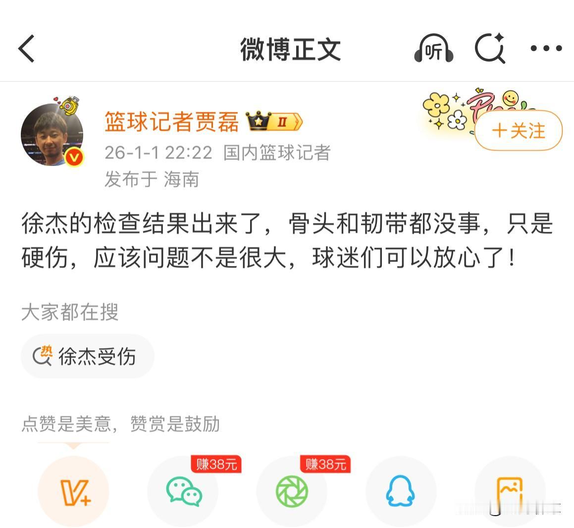 徐杰受伤最新消息!在刚刚结束的北京首钢对阵广东的比赛中,萨姆纳行进间推倒周琦导致徐杰膝盖侧面受伤!徐杰至中场没有出来,缺席整晚的比赛,他膝盖侧面被冲撞严重。杜峰在赛后发布会中透露,徐杰受伤后已经第一时间去医院拍片,具体伤情要等检查结果!篮球记者贾磊发文称:“徐杰的检查结果出来,骨头和韧带都没事,只是硬伤,无大碍”!徐杰对球队太重要,但愿不会有事!