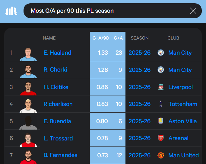 虎扑01月02日讯数据网站statmuse统计了本赛季英超每90分钟参与进球榜。