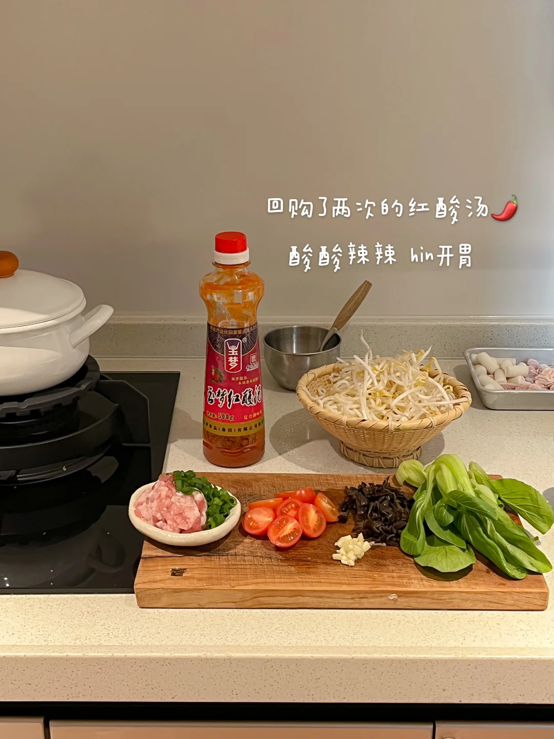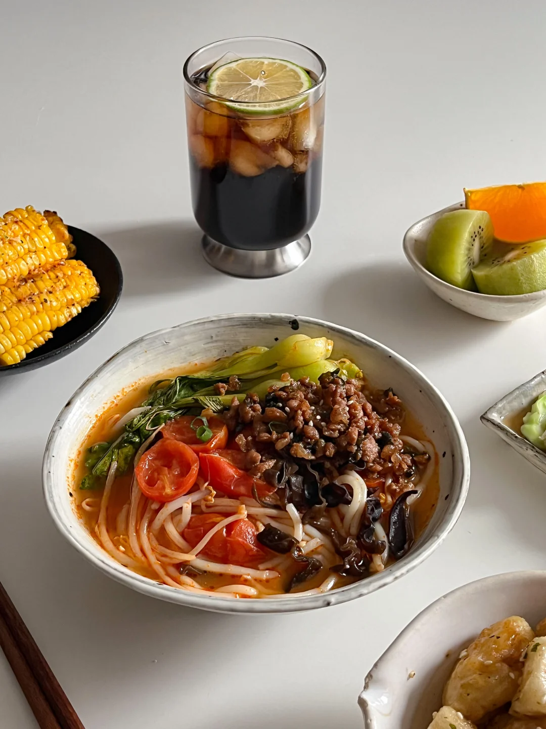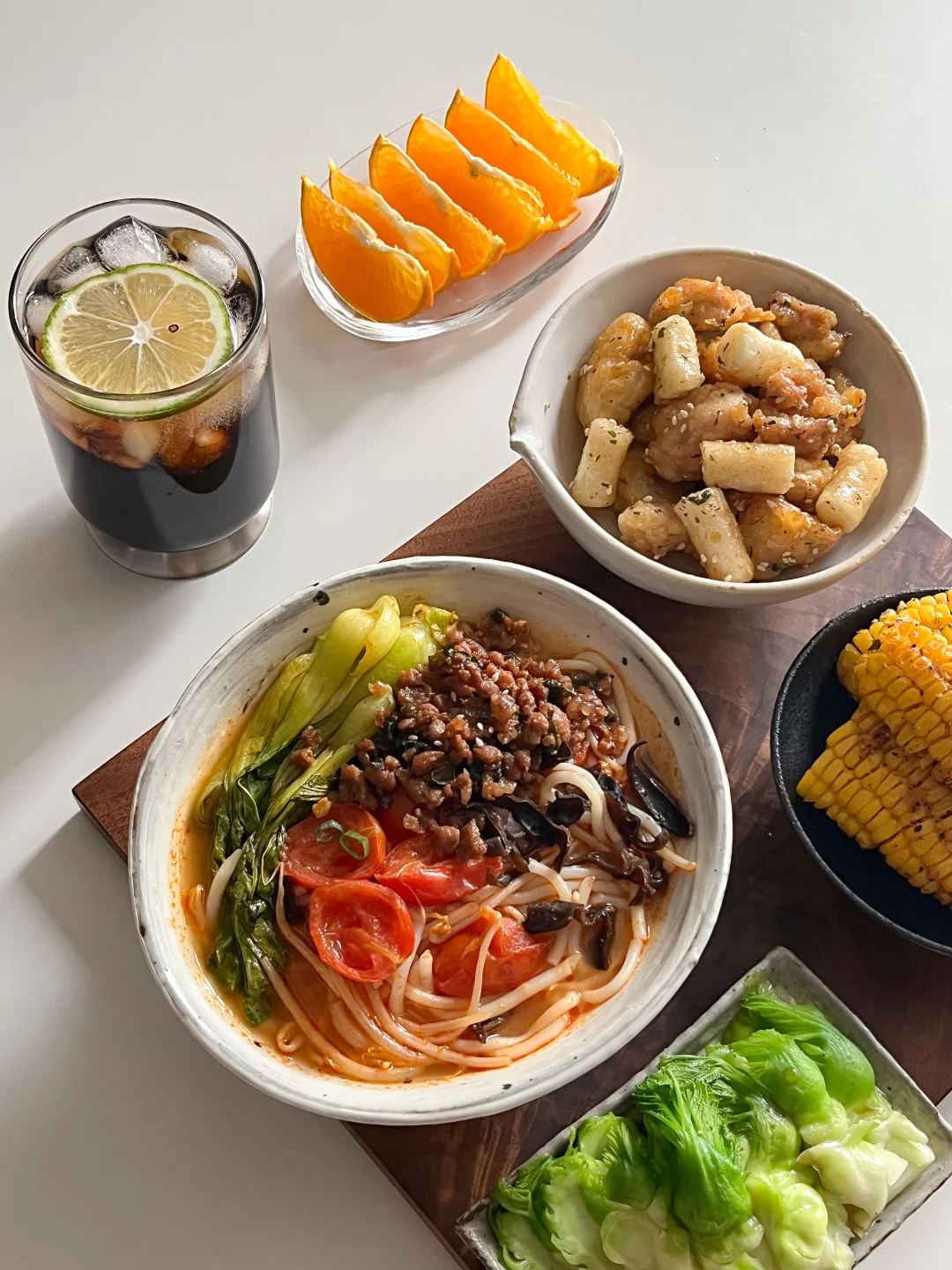 肉酱红酸汤米线🌶 豉汁儿菜🍃 辣芝士烤玉米🧀 黄油蜂蜜年糕炸鸡🍗 青柠冰可乐🥤