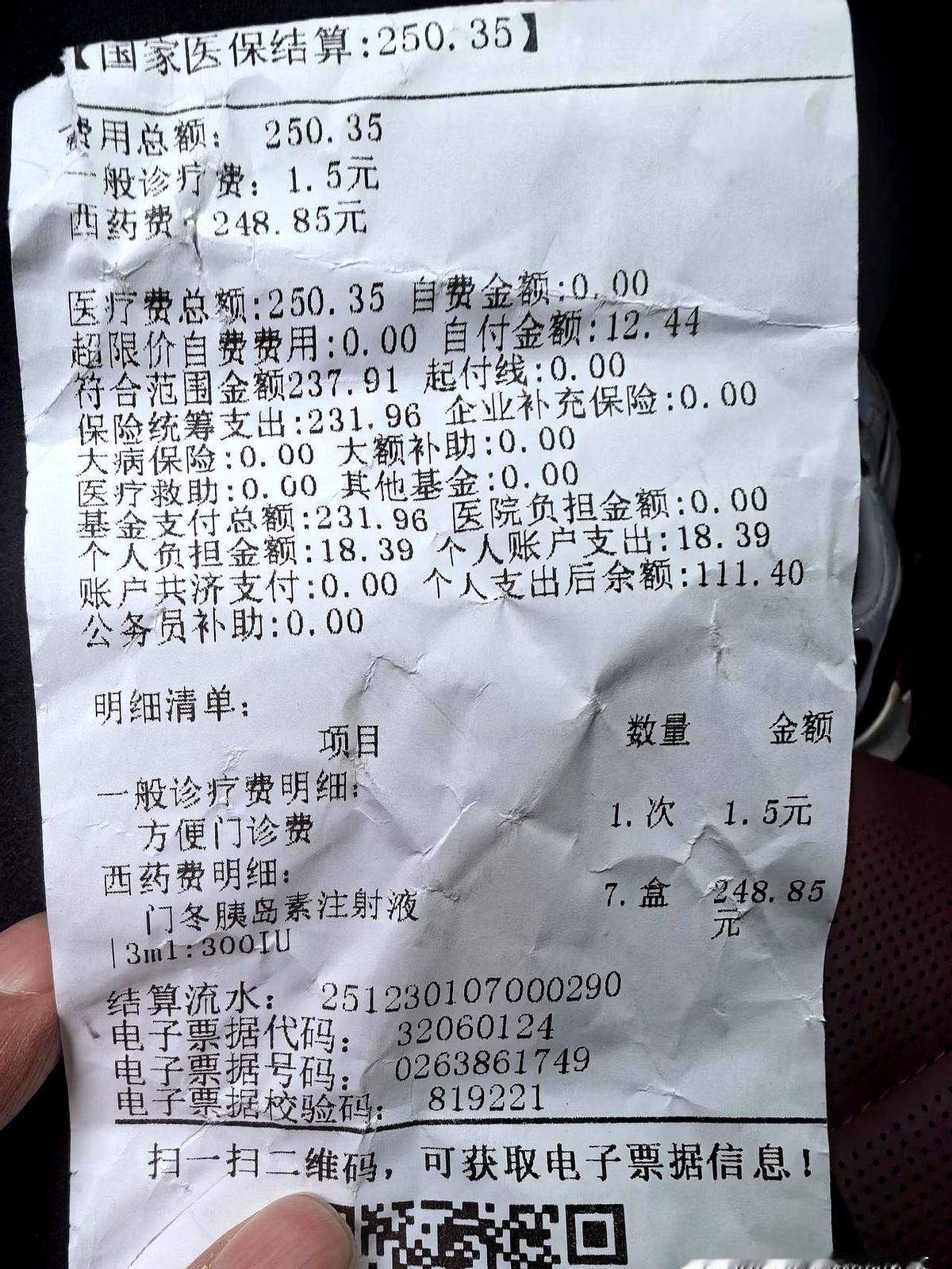 昨天我跟进一桩小得不能再小的社区就医记录—挂号两块钱买胰岛素七支不到两百五十块刷医保后病人掏十二块四毛四—从排队到拿药二十分钟搞定这张被他贴在朋友圈的收费单截图比任何宣传片都来得直白因为数字会说话也很扎心地提醒身后那群为处方药肉痛的人们谁不想被这样“降维护体”一下呢。 别急着上头先看机制同款门冬胰岛素在谈判前一支动辄七八十进集采后均价三十多按国家医保局公布的数据2022年糖尿病用药整体降幅四成起跳社区卫生中心还有“门特”身份加成可以用统筹基金一口气报销九成多于是原价二四八·八五元的七支药秒变自付十二块这不是天降红包而是集采和医保的双重杠杆砸出来的结果。 不过跑一趟社区就能解决全部痛点的前提是你所在城市配套跟得上比如定点机构够不够多电子医保卡能不能秒刷部分地方还卡在人工录入慢到想砸键盘更别提跨省结算门特认定等流程也可能把慢病患者来回折腾外加一些热门胰岛素型号短供偶尔缺货政策的“价格红利”落地仍得和现实的“可及性”赛跑。 现实也不只价格账医学界估算糖尿病患病率超12%却有近半数人未被诊断很多人等到并发症敲门才想起医保卡这意味着医保再慷慨也只是最后一道篱笆公共卫生的前哨—早筛教育基层随访—要一起补齐否则报销再高也不过是打补丁。 话说回来朋友圈这张小票还是值得被点个赞它证明规则完善能让利于民也提示我们盯紧执行到位的细节接下来药品集采可能扩围医保个人账户要不要“家庭共济”也还在路上你觉得这种省钱体验能不能成为常态欢迎留言分享你最近一次看病买药的账单让我们继续对账看看该把目光投向哪些还没补上的空档。