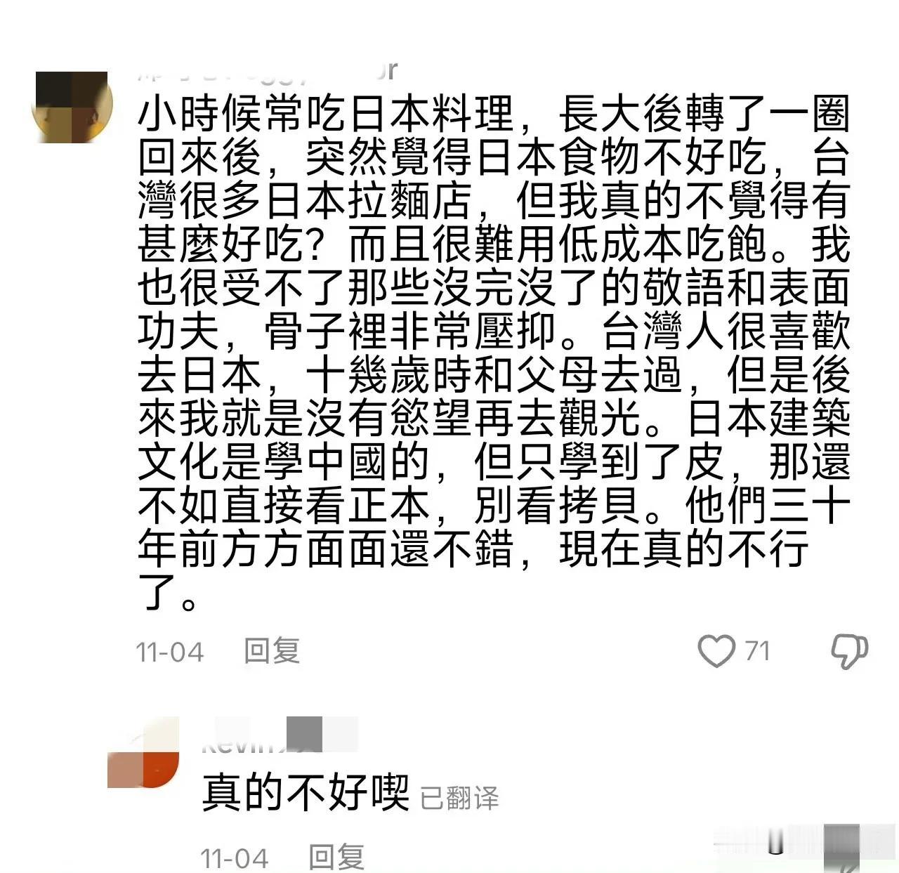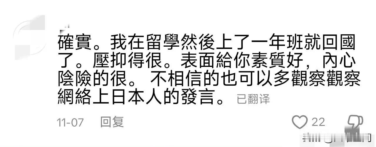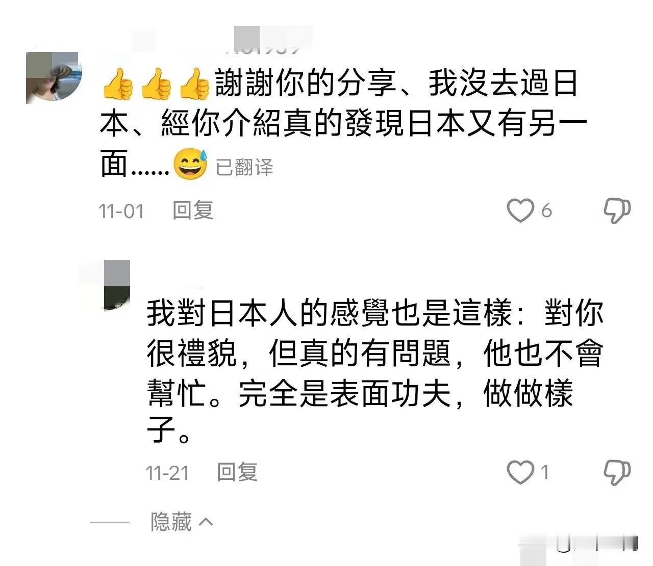 各国网友吐槽日本人的有礼貌有素质都是装的,几乎都有一个共同的感受,就是日本表面上很有礼貌,很有素质,但是你就是感觉它们哪里有问题,因为他们除了嘴上有礼貌,有素质,它们从来都不帮助你,完全就是表面功夫,做做样子,转过身去,不定心里怎么诅咒你呢!而且日本骨子里非常压抑,这也是各国网友的共同感受,所以为什么表面有礼貌,有素质,好像很可爱的样子,但历史上却能做出很多违背基本人性的侵略和屠杀的事情出来,这才是真实的日本!