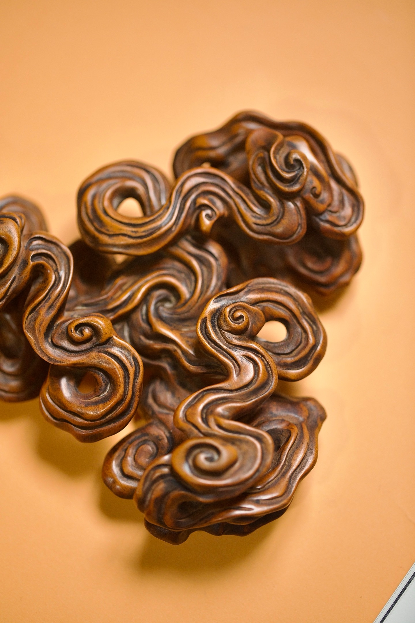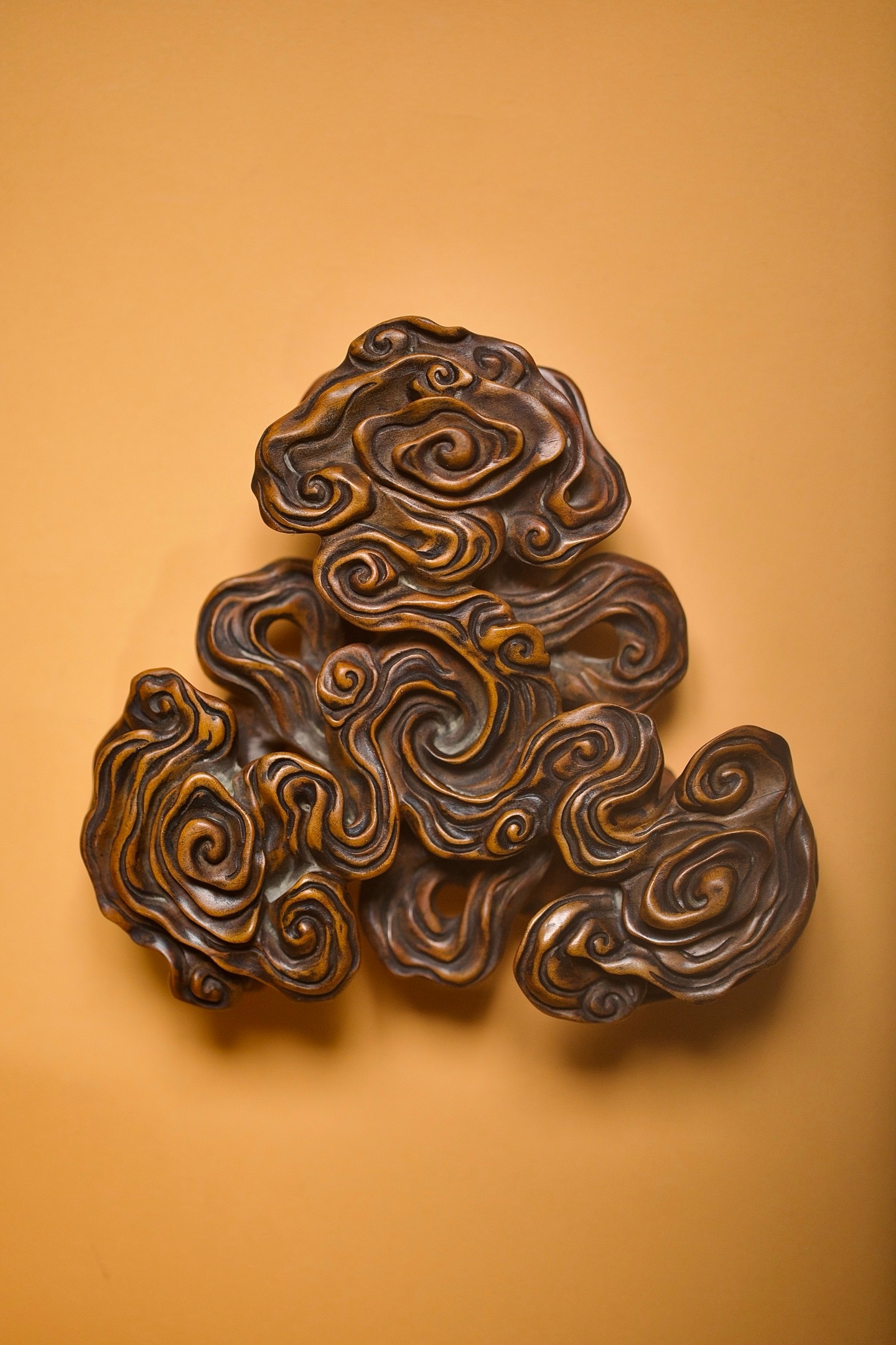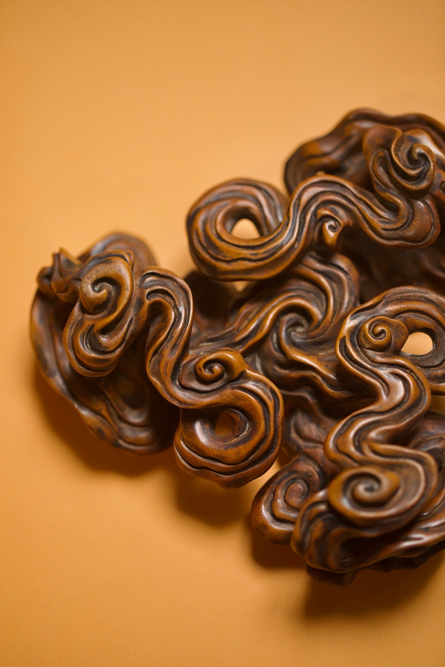 黄杨 | 云纹底座这方黄杨木底座,以「祥云」为形,取「承载」之意。每一道云纹都蜿蜒舒展,如流动的诗篇。它不仅是器物的基座,更是一方意境的延伸。置于其上,无论是奇石、雅器还是文玩,都仿佛有了云雾托举的仙气。14×12.3×4cm