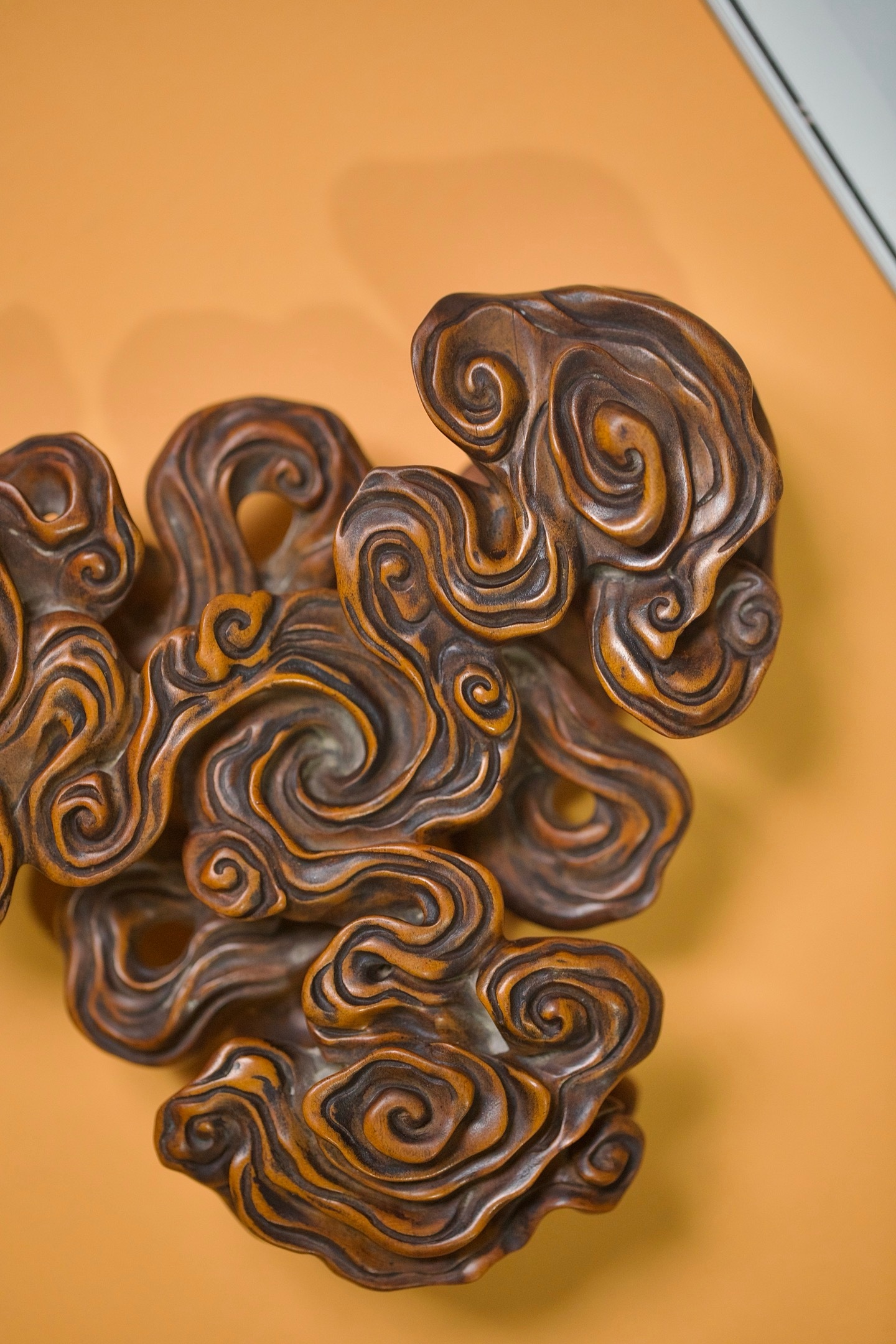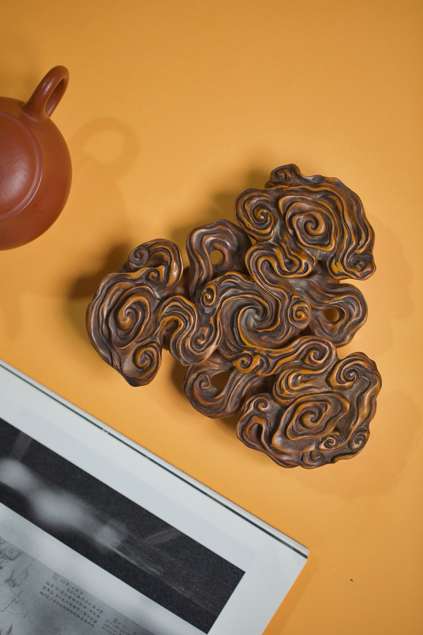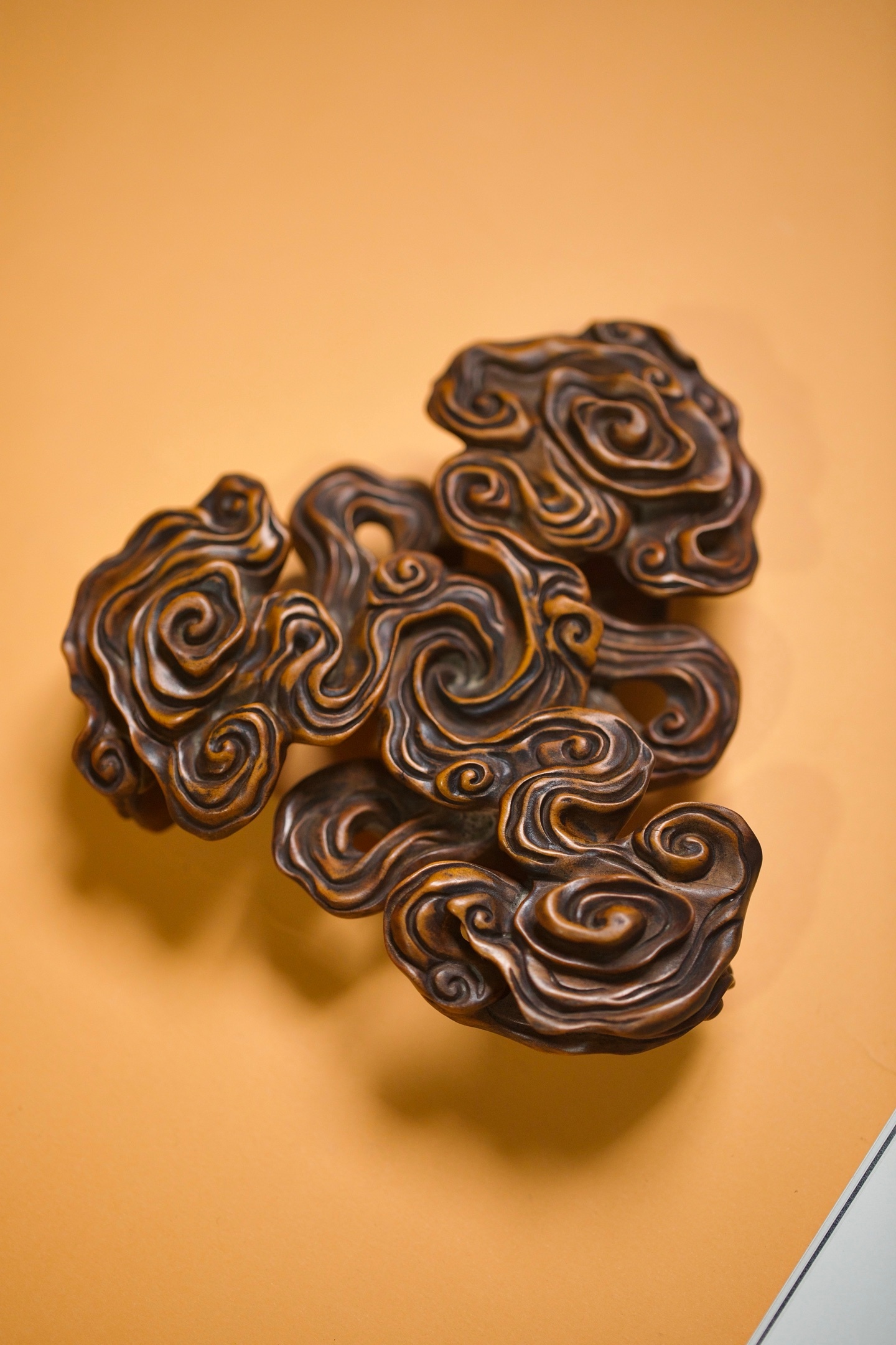 黄杨 | 云纹底座这方黄杨木底座,以「祥云」为形,取「承载」之意。每一道云纹都蜿蜒舒展,如流动的诗篇。它不仅是器物的基座,更是一方意境的延伸。置于其上,无论是奇石、雅器还是文玩,都仿佛有了云雾托举的仙气。14×12.3×4cm