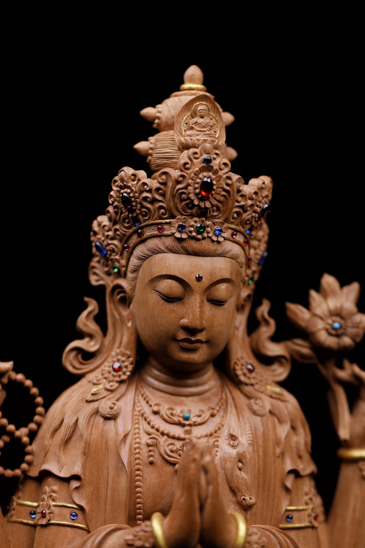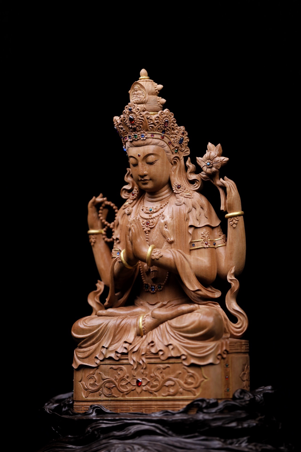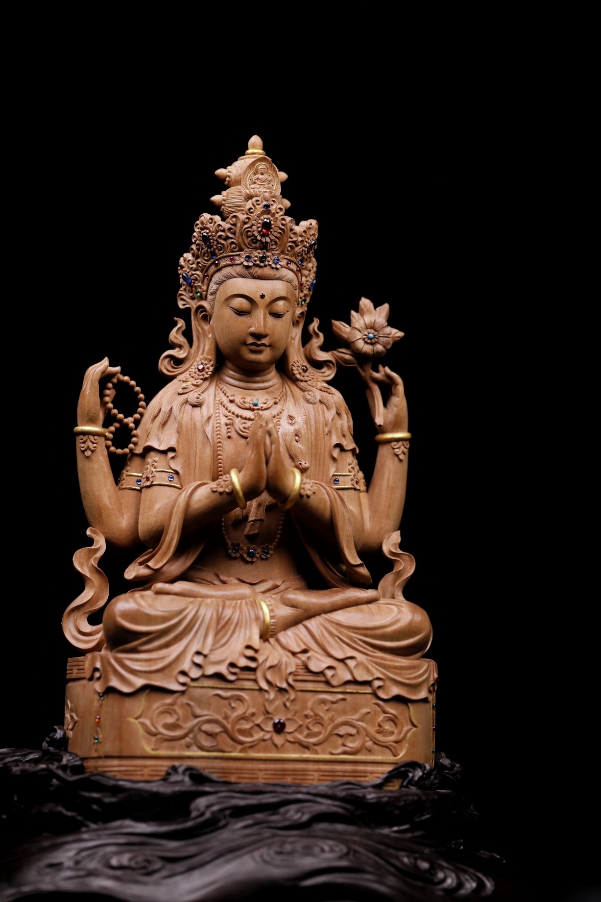 老山檀香|四臂观音 清刀造像老山檀整料清刀雕刻,醇香凝魄,观音低眉渡众生。 璎珞嵌宝流光转,衣袂莲纹层叠如月华倾泻,其四只手臂各有象征:主臂合十表虔敬,一手持莲花喻清净,一手握念珠示度化众生。四臂观音属于观音的化身之一,是藏传佛教中重要的本尊,禅意悠远,供奉典藏皆宜!老山檀规格:15×9×27cm重976g底座:27×15×8cm整体高33cm