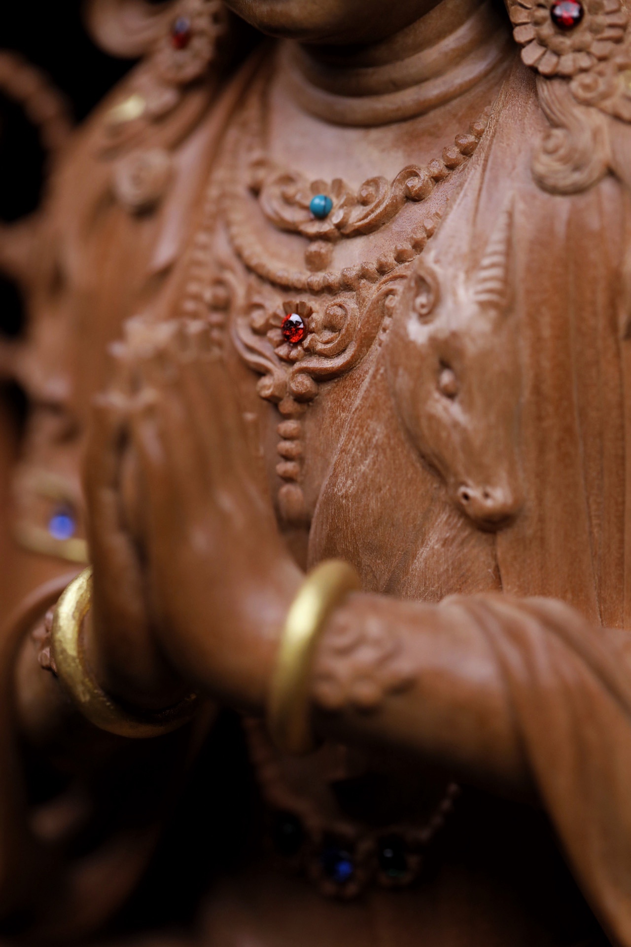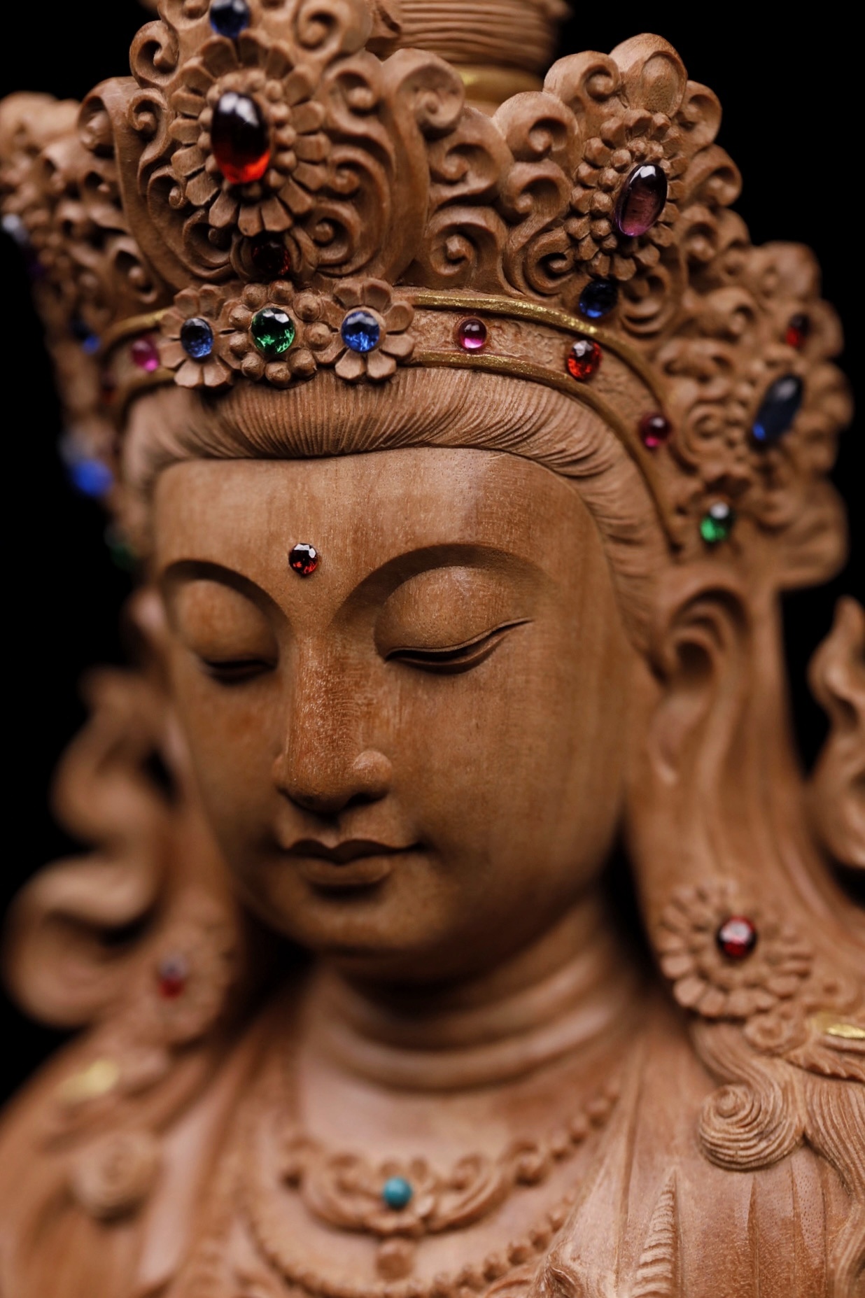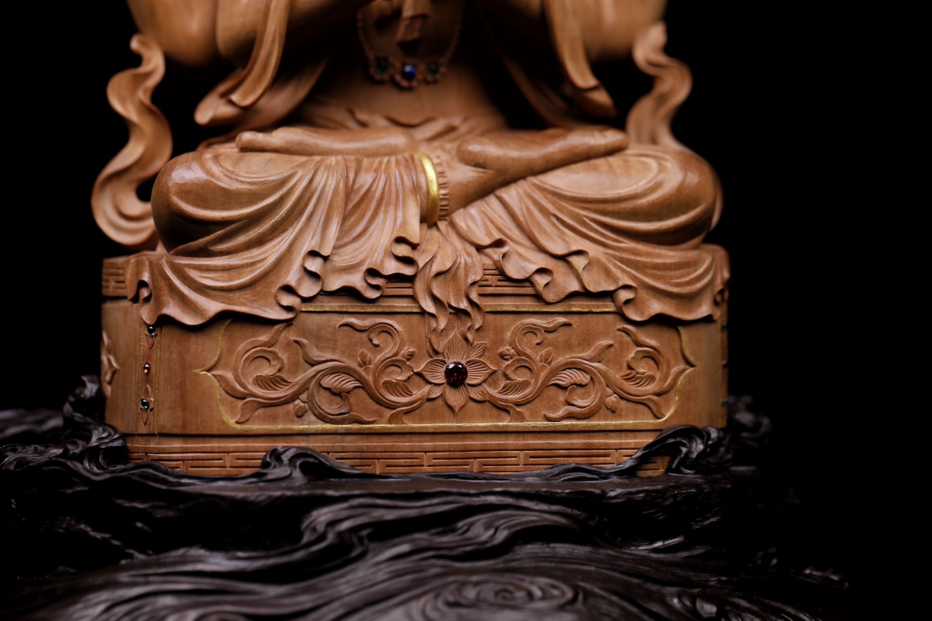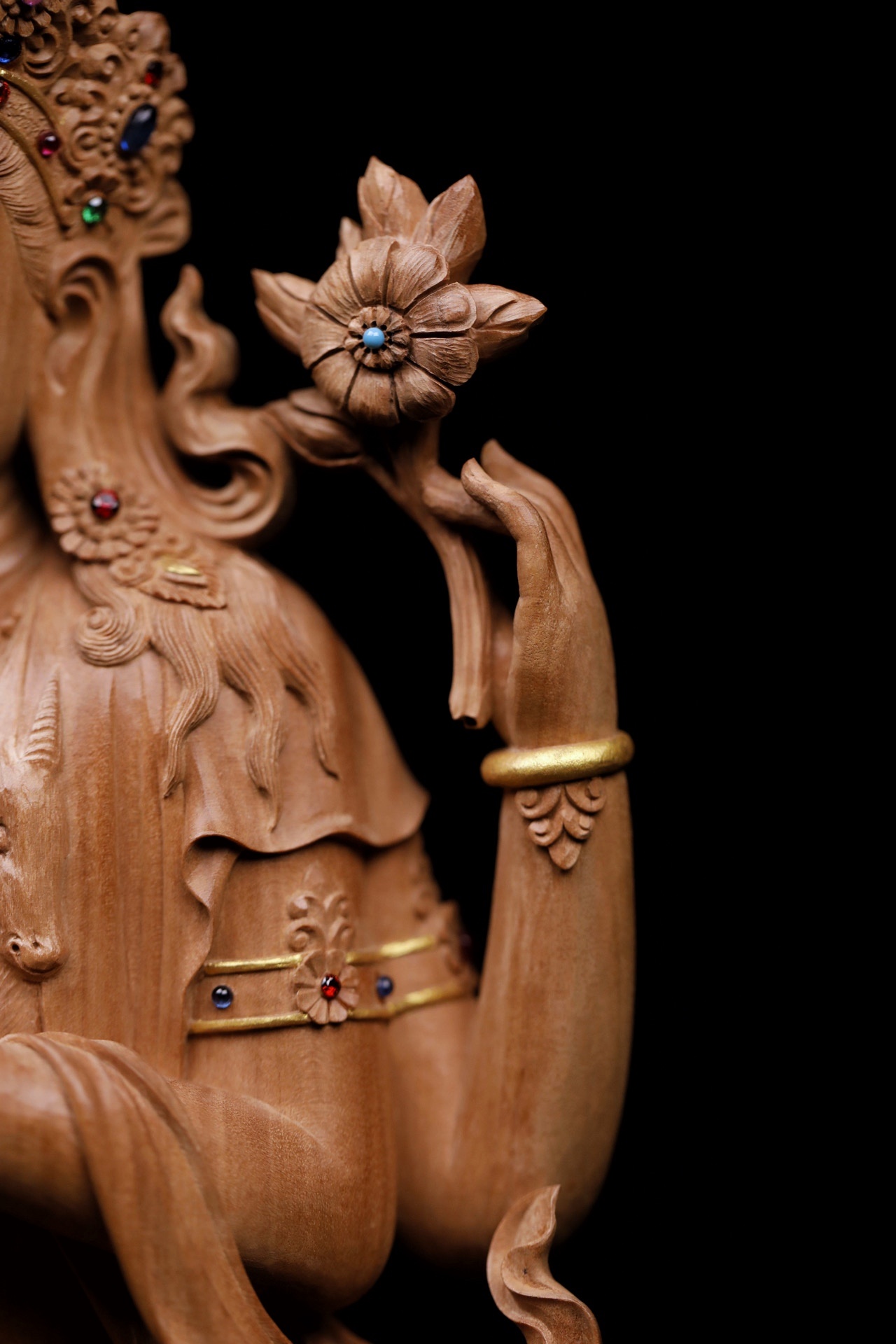 老山檀香|四臂观音 清刀造像老山檀整料清刀雕刻,醇香凝魄,观音低眉渡众生。 璎珞嵌宝流光转,衣袂莲纹层叠如月华倾泻,其四只手臂各有象征:主臂合十表虔敬,一手持莲花喻清净,一手握念珠示度化众生。四臂观音属于观音的化身之一,是藏传佛教中重要的本尊,禅意悠远,供奉典藏皆宜!老山檀规格:15×9×27cm重976g底座:27×15×8cm整体高33cm