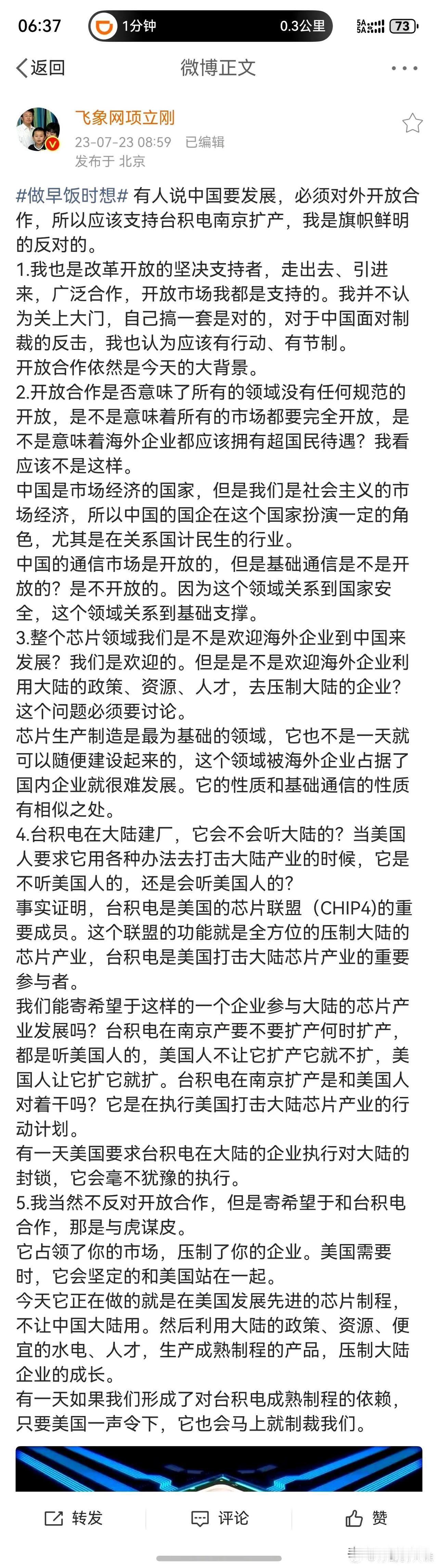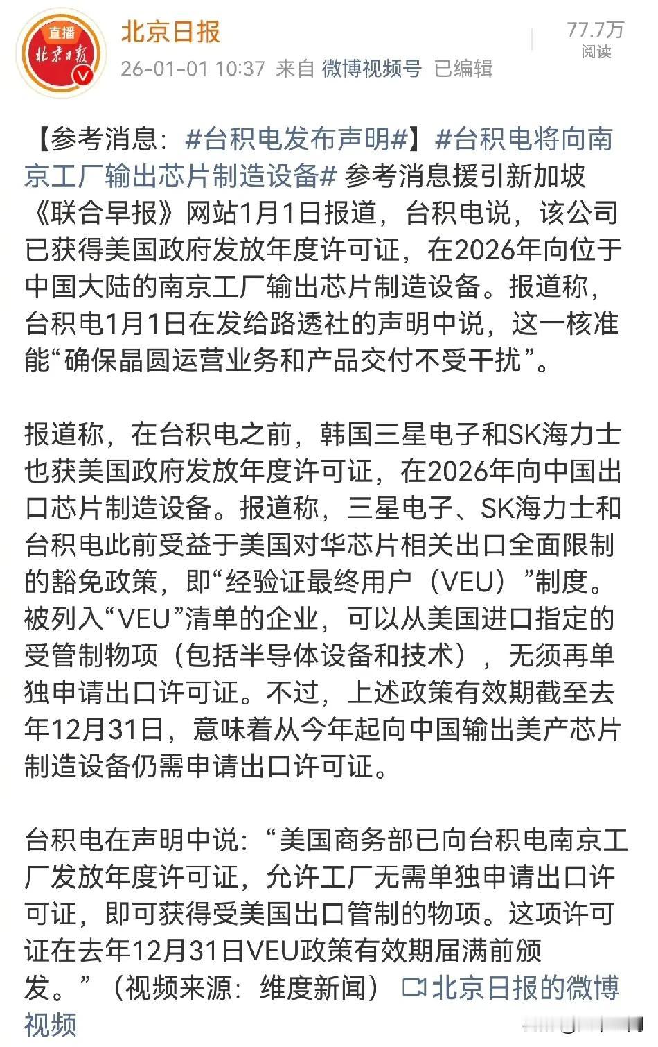 两年前项立刚反对台积电南京厂扩产,很多人出来骂他,现在真的被他说中了,台积电在元旦这一天宣布将向南京厂输出芯片制造设备,而且是得到美国许可的,包括韩国的两个芯片也都获得了这种许可! 美国现在这么做是为什么,应该就不需要说了吧,美国现在已经调整了芯片战的路数,你没突破技术的时候,我限制你设备,等你技术突破了,需要市场的时候,我就放开限制,换了另外一种方式来搞你!当初那些骂项立刚现在都不说话了!