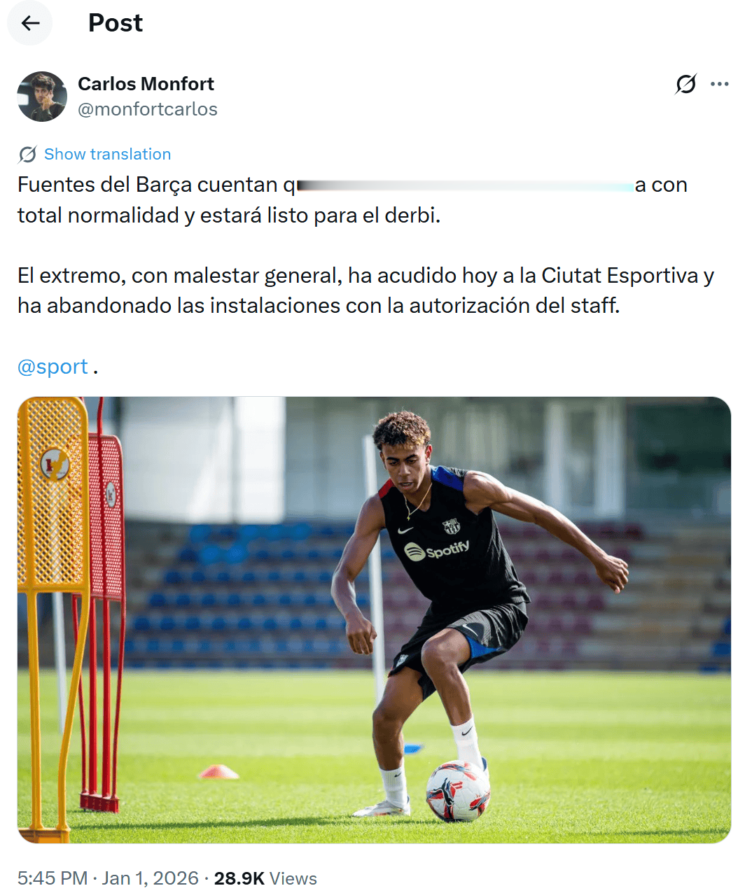 消息指出,亚马尔今天在身体不适的情况下前往了体育城,随后在工作人员许可下离开了训练基地。
