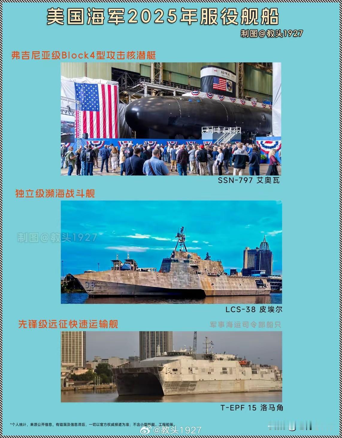 美国海军2025年服役舰船盘点:仅2艘新船,其中1艘还是残废! 2025年4月,美国海军第24艘弗吉尼亚级核攻击潜艇爱荷华号服役,属Block IV批次,长约115米、排水量7800吨,装备鱼雷发射管和战斧巡航导弹垂发,静音性能好,2017年开工用了8年;当年仅1艘服役,第25艘马萨诸塞号11月交付,2026年春季才服役。