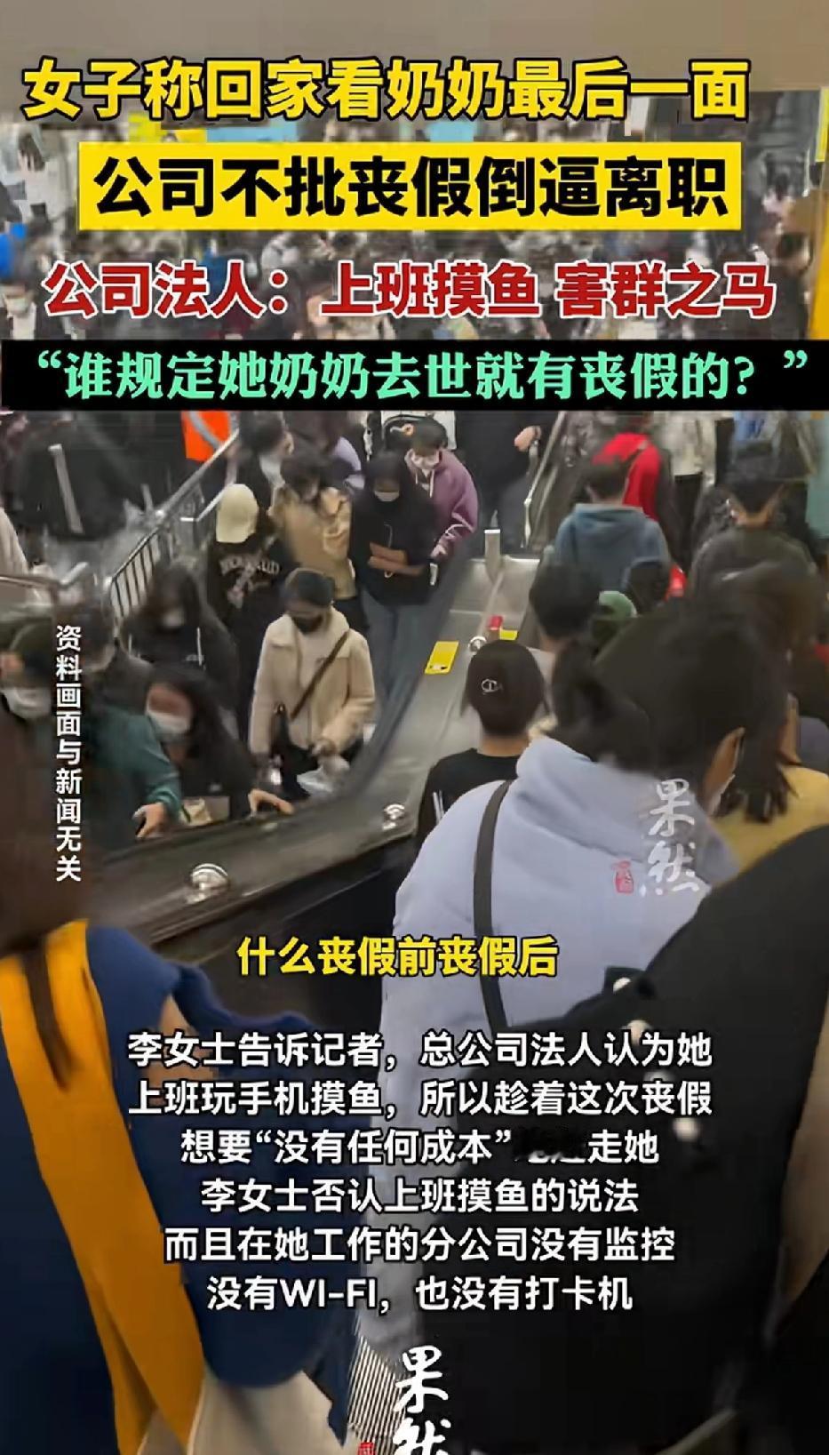 女子称回家看奶奶最后一面,公司不批丧假倒逼着离职。 公司法人林先生:上班摸鱼 害群之马,“谁规定她奶奶去世就有丧假的?” 2025年7月,江苏常熟的李女士遭遇了糟心事。奶奶去世,她申请5天事假,经理和人事都同意了,她才坐上回家高铁。 可车上却收到人事消息,总公司法人不批准,让她离职才能回家。李女士当即表示:不请假回来上班可以吗?人事说不行,回来了要么自己辞职,要么公司开除。 李女士上班有没有摸鱼不好说,单凭公司法人质问那句 “谁规定她奶妈去世就有丧假”这句话这公司就太没有人性化管理了。 经理和人事都同意了,法人却叫上劲了,这种情况太少见了吧! 李女士想丧事办完再协商,人事不松口。原来法人觉得她上班摸鱼,还称华她害群之马。想借机赶走她,“又不想付出任何成本”。 李女士否认上班摸鱼的说法,公司没有监控,也没有打卡机,没wl-fl。法人口中所谓的玩手机摸鱼,和害群之马,这些称谓自己绝对不认的。 公司不仅逼她离职,在职一年多还没给她交社保。李女士寄出《被迫解除劳动关系通知书》,公司只给了基本工资。如今她申请了劳动仲裁,2026年1月29日开庭,希望她能维权成功。