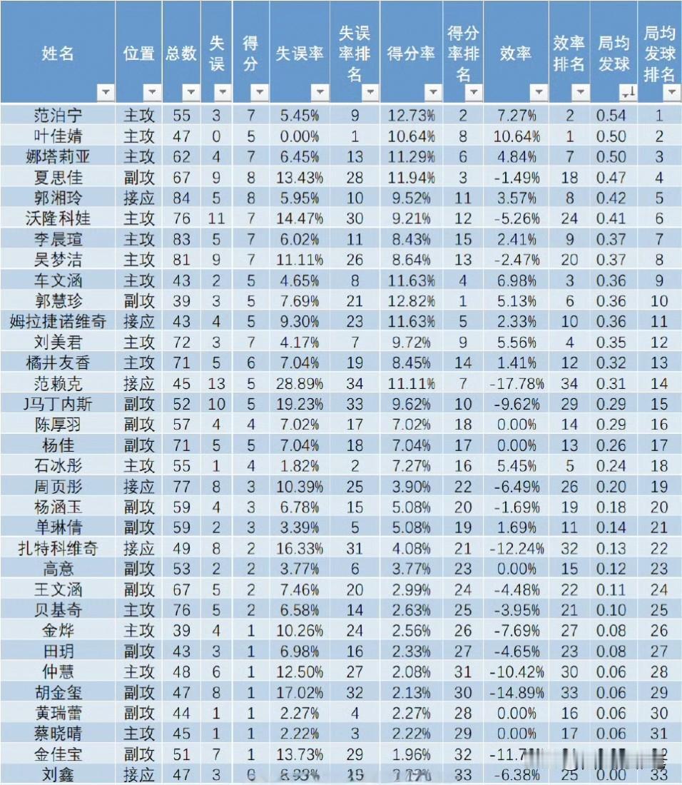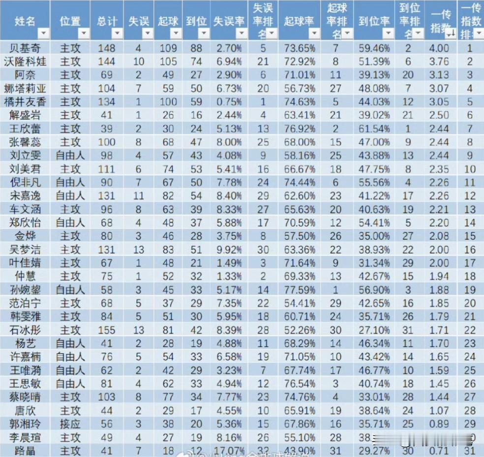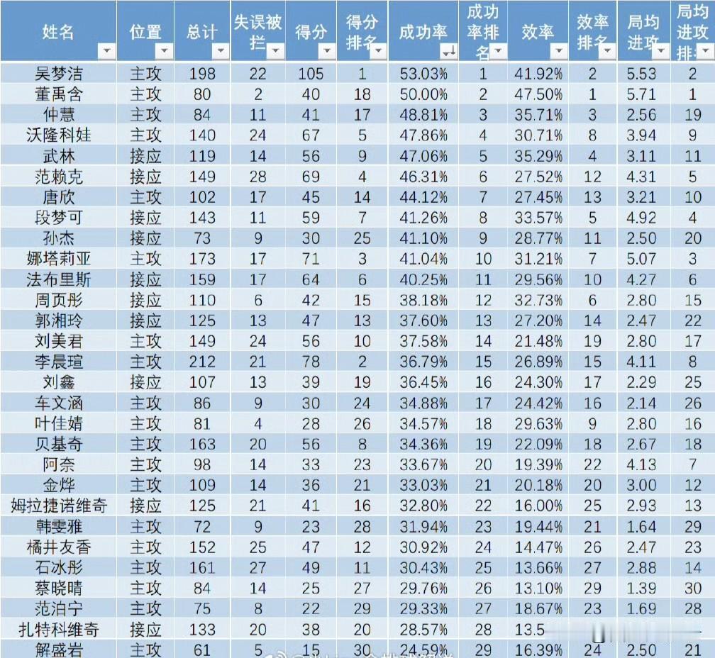 晒晒中国女排联赛榜单(前5轮),看看你心爱的球员排第几 主攻榜,吴梦洁和董禹含,霸榜均局前2,她们名副其实。 副攻榜,有点意外,新秀夏思佳,郭中楠冲到最前面 发球榜,范泊宁表现很出色 一传榜,前五被外援包揽,吴梦洁仅排到16。 你喜欢的球员排名多少。 女排全国联赛 女排联赛 女排实力 中国女排超联赛