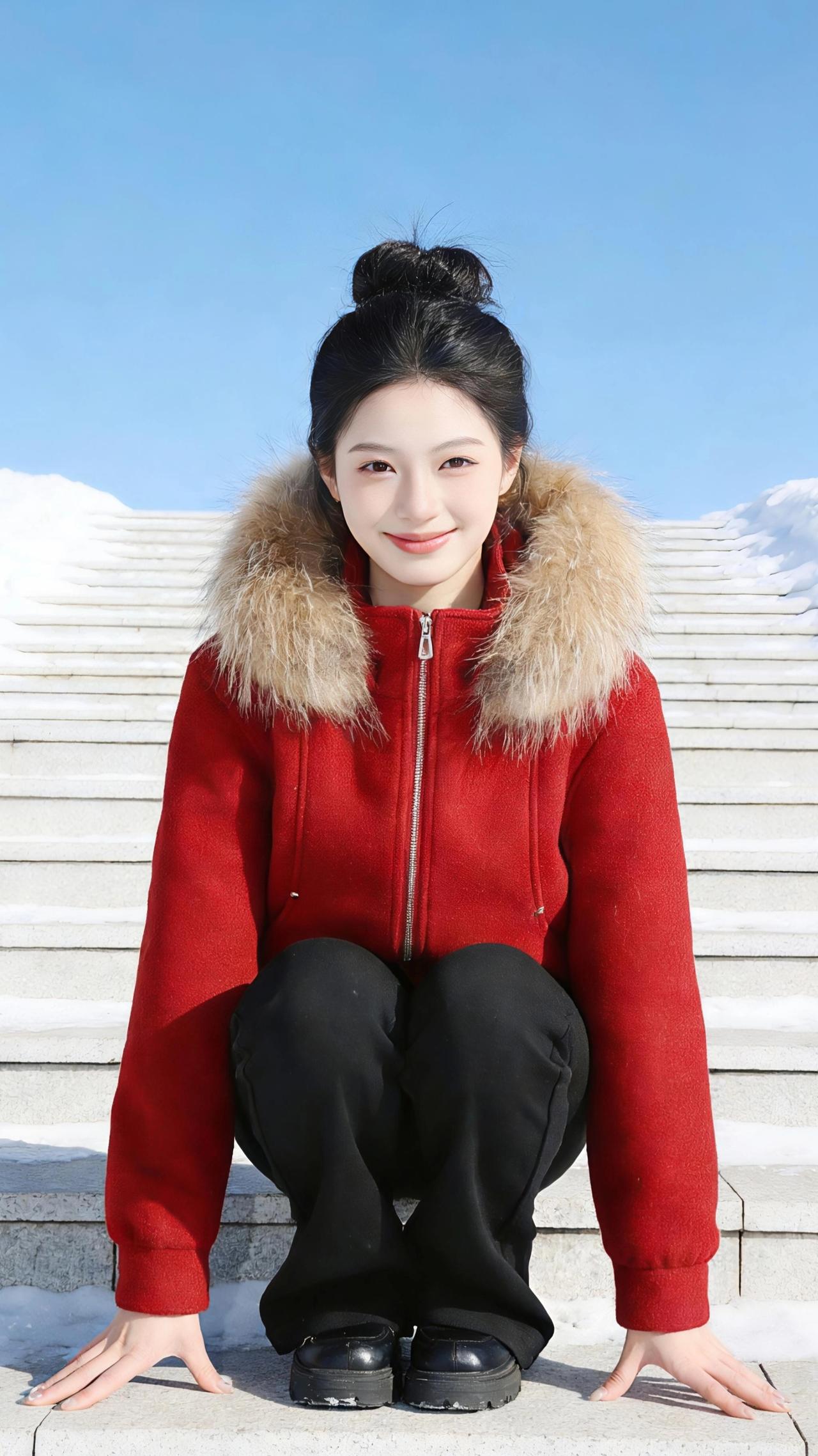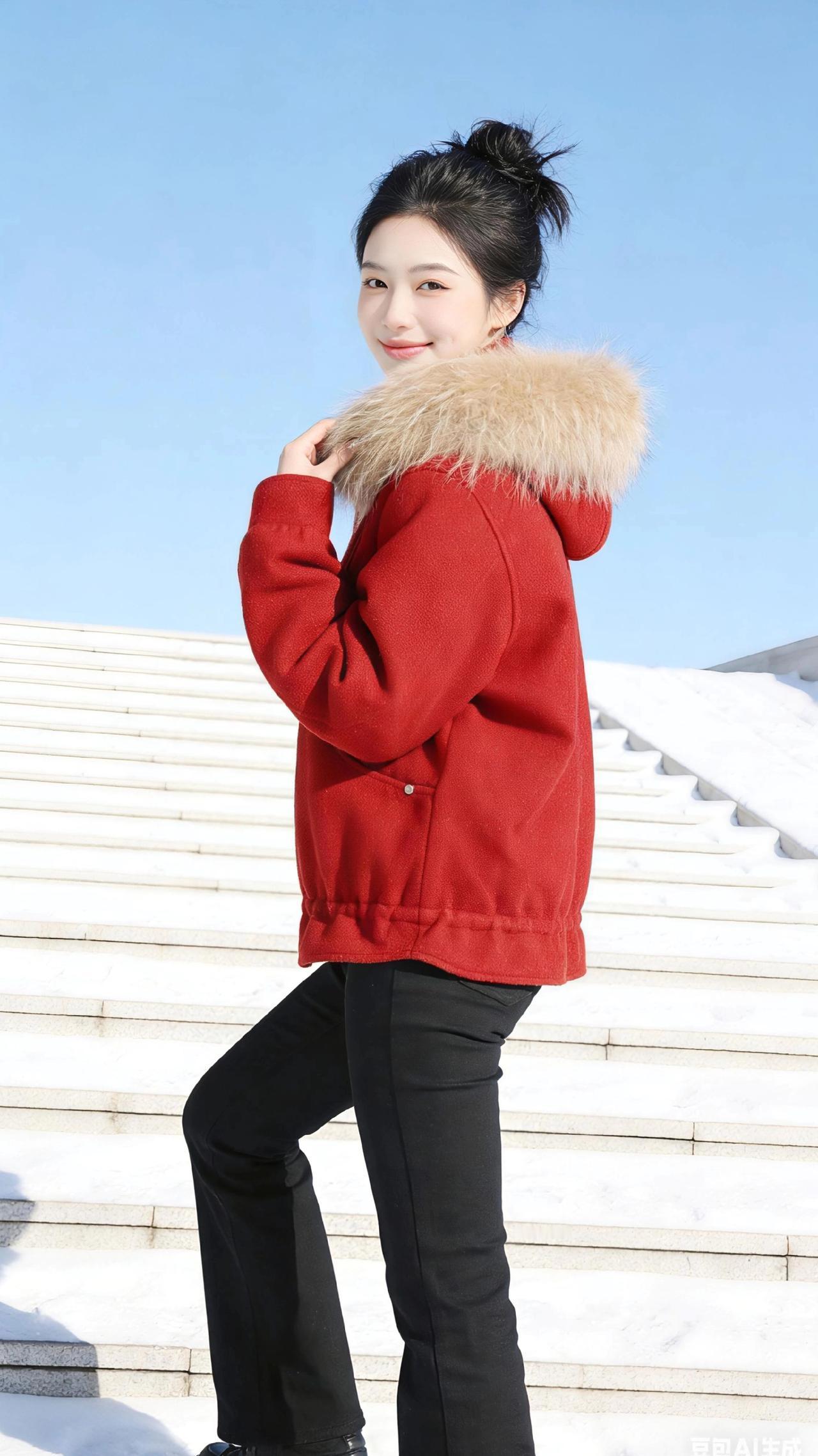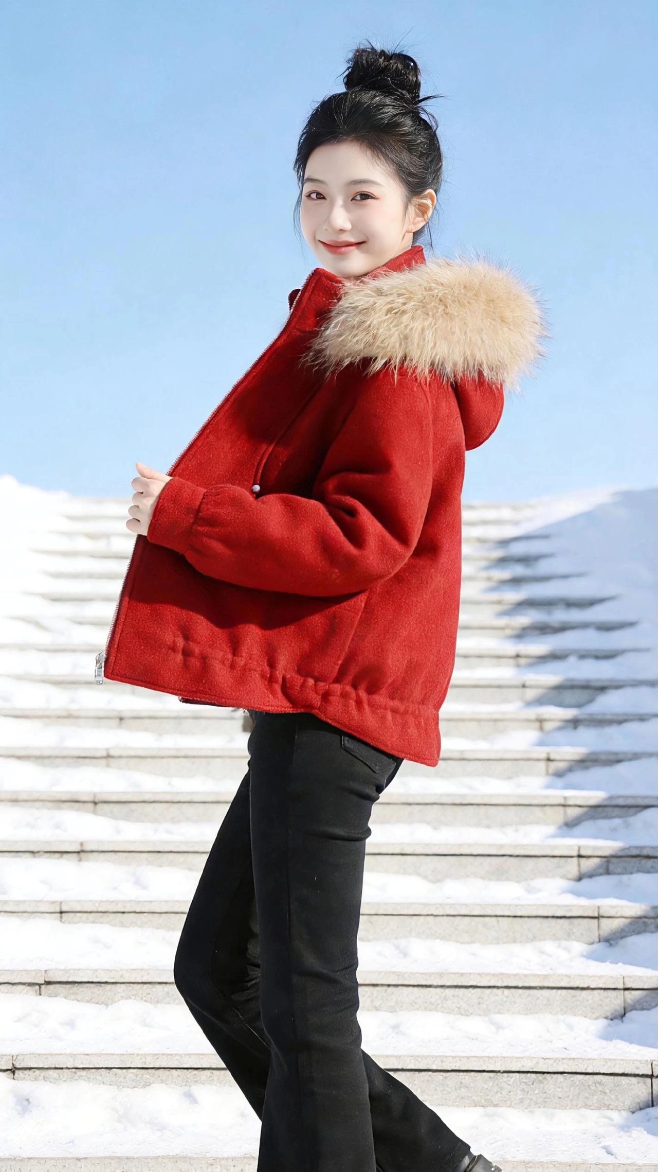 红袄映雪 正红的短袄裹着冬日的鲜活,毛领蓬松如浅金色的云,落在肩头,把凛冽的寒风都柔化了几分。她立在覆雪的石阶上,蓝天作幕,白雪为衬,那抹红便成了冬日里最热烈的笔触。 丸子头高高束起,漏出光洁的额头,眉眼弯起时,像融了雪的暖阳。蹲在石阶上时,手掌轻贴冰凉的石面,笑意浅浅;转身回眸的瞬间,指尖轻勾毛领,又添了几分灵动;双手插兜站定,红袄与黑裤撞出利落的线条,却被唇角的笑揉得温柔。 忽而抬手捧住脸颊,笑意漾开在眼底,又或是踮起脚轻旋,红袄的衣角随动作扬起,像冬日里绽开的一朵红玫。雪光映着红袄,红袄衬着笑靥,天地间的清寒仿佛都被这抹明艳的红驱散,只余下少年意气的鲜活,和冬日独有的浪漫。 过年穿什么 冬季穿搭 新年穿搭 棉服外套