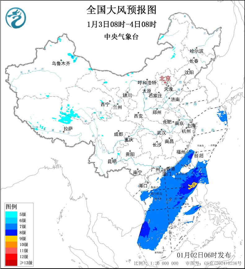 预计,1月2日08时至3日08时,黄海大部海域、东海、台湾海峡、台湾以东洋面、巴士海峡、南海大部海域将有7~8级、阵风9~10级的大风,其中台湾海峡、巴士海峡部分海域风力可达9级、阵风10~11级,北部湾将有7级、阵风8级的大风。