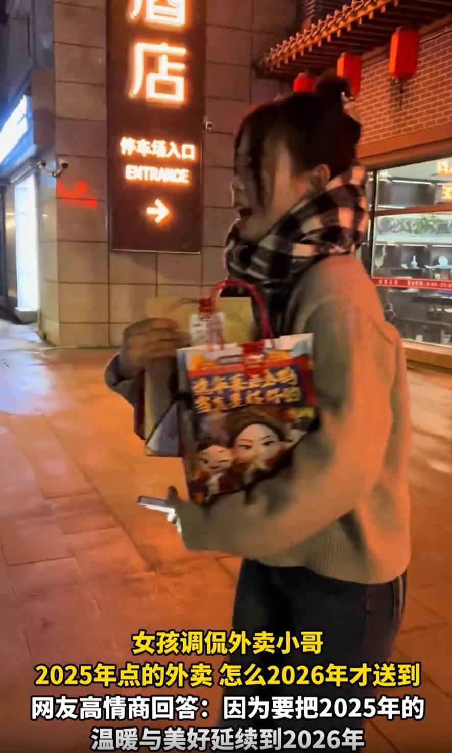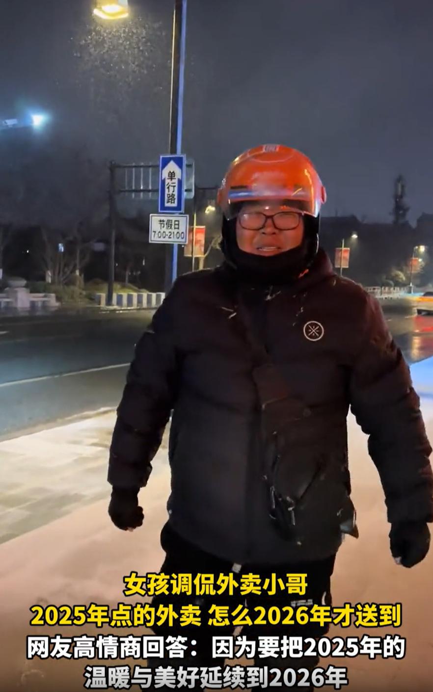一单外卖送了一年!河南,女子和朋友在跨年夜点了份外卖,本想着边吃边跨年,结果外卖小哥迟到,外卖送到时已经过了十二点,但女子并没有差评,也没有生气,反而调侃说:怎么我2025年点的外卖,2026年才送到啊! 视频中,她和朋友下楼取外卖,外面还在下雪。跨年夜,路滑、单多、时间卡在最尴尬的点,小哥还在送。她看见了,也就没法真生气。调侃一句,小哥不好意思地笑了笑,回了句新年快乐。这单外卖,就这么结束了 对此,不少网友也是纷纷高情商帮忙解围 有网友说:这时候外卖小哥应该说:因为我要做2026年第一个给你送外卖的人 还有网友表示:因为要把2025年的温暖与美好延续到2026年 这事打动人的地方,不在于外卖迟到多久,而在于双方都没有把情绪往坏的方向推。女子没有拿规则压人,小哥也没有敷衍摆烂。两句玩笑,把本来可能变味的一单,变成了一个挺体面的收尾 现在很多矛盾,都是这样被放大的。迟到一分钟,就上纲上线;一句解释不合心意,就开始对立。平台有平台的规则,消费者有消费者的权利,这些都没错。但生活里真要每一件事都卡到最硬的标准,最后累的还是自己 跨年夜送外卖,本来就是一件不轻松的事。下雪、路远、时间点尴尬,这些现实因素摆在那儿。女子选择看见这些,而不是只盯着迟到这一个结果。不是她吃了亏,而是她给这件事留了余地