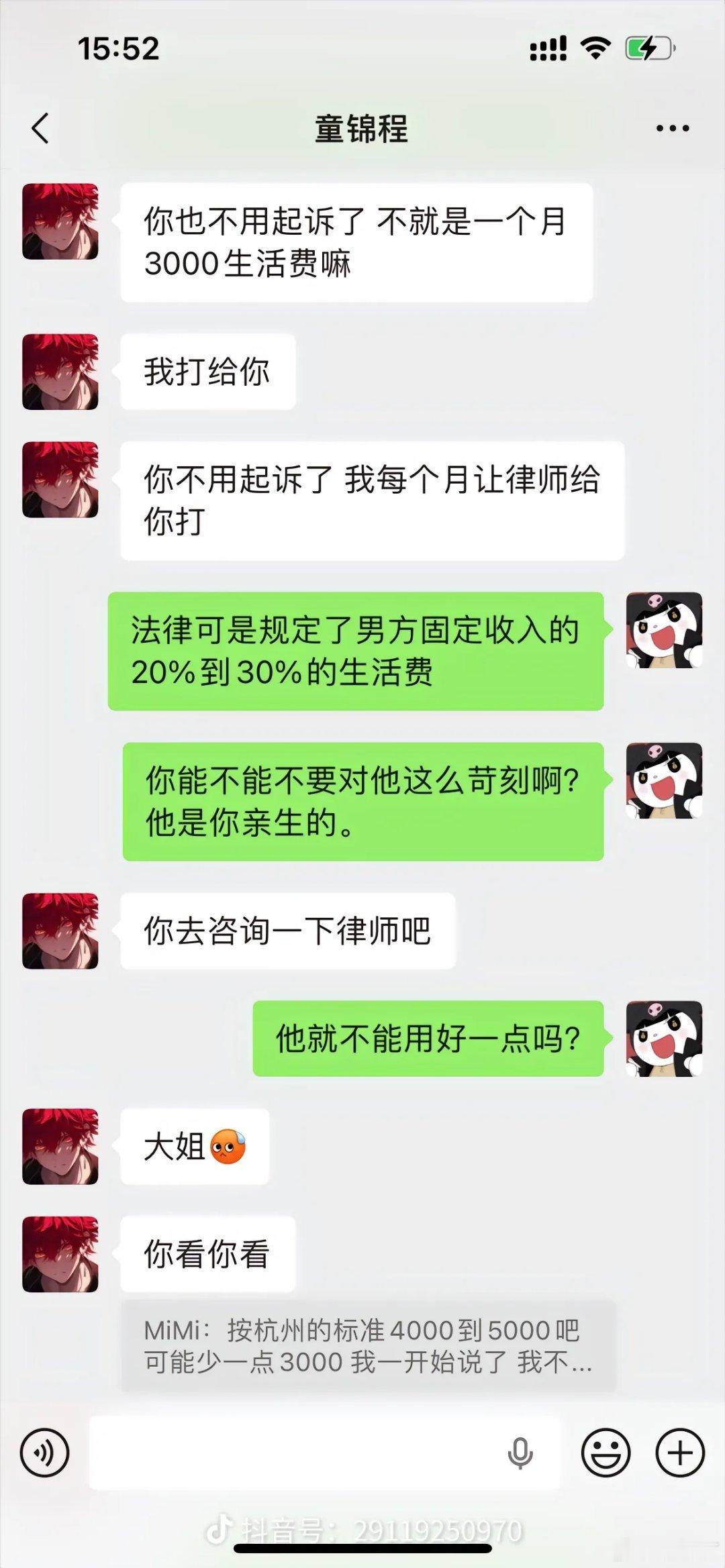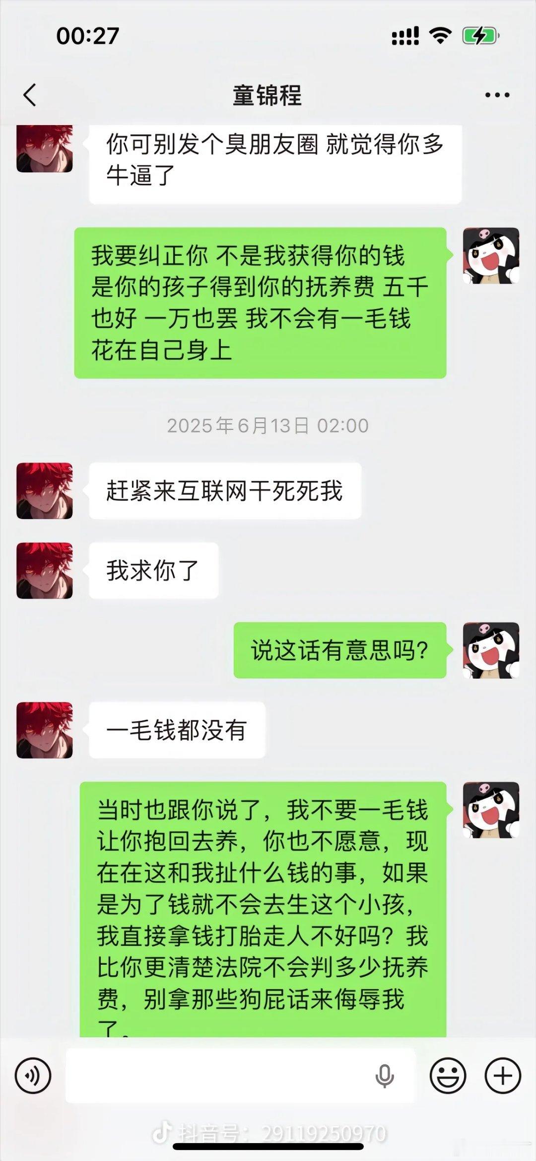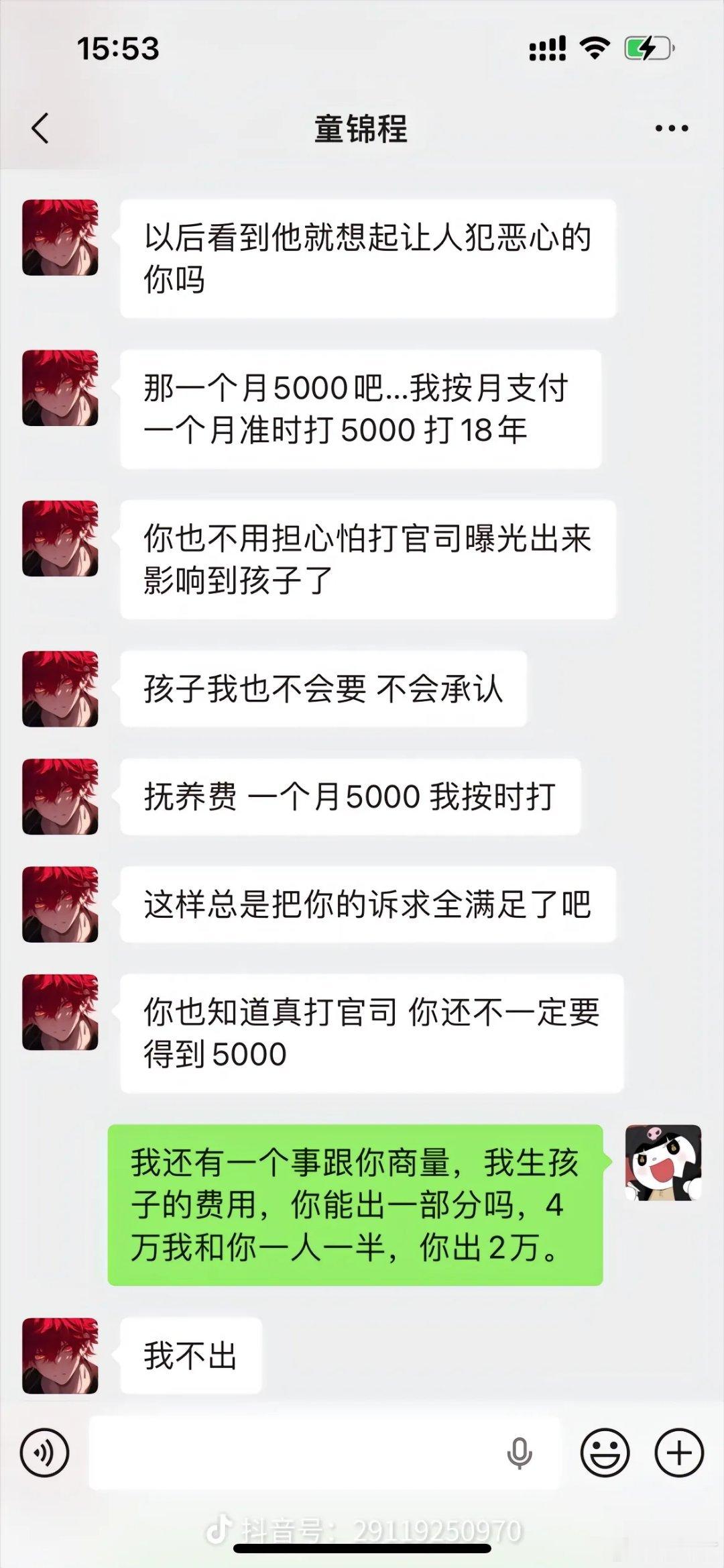 童锦程回应有孩子“我才不会发到网上,我的孩子以后要安静的生活。””法律可是规定了男方固定收入的20%到30%的生活费。”“我还有一个事跟你商量。我生孩子的费用,你能出一部分吗?4万我和你一人一半,你出2万。”“按一个月一万算,毕竟是你亲生的,你也不要对他太苛刻了行吗?一年12万,18年一共216万,再支付我生孩子的医药费算4万,一共220万。”“我要纠正你,不是我获得你的钱,是你的孩子得到你的抚养费。五千也好一万也罢,我不会有一毛钱花在自己身上。”“孩子是不是他的就不用怀疑了,亲子鉴定随便,我人正不怕影子斜。”我不行了,这聊天记录怎么越看越乐啊?前面还说不曝光呢,眼见童锦程这边不愿意给钱,说过的话也不管了。220万抚养费没要到,不仅让聊天记录上网,孩子长相也是一张接一张的发。更幽默的是,她还重新定义了「身正不怕影子斜」。姐,你撒谎自己对橡胶过敏,骗对方不要戴套,还说自己长期吃药。不就是想生个对方的孩子,好母凭子贵吗?可惜对方是童锦程,他不吃你这套。曝童锦程有孩子