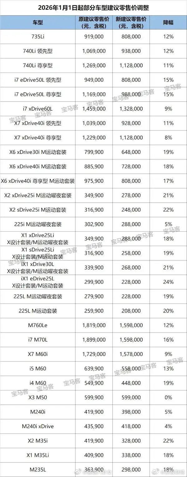 重磅!宝马开年官降!最高下调30万元!新年伊始,宝马自2026年1月1日起,对