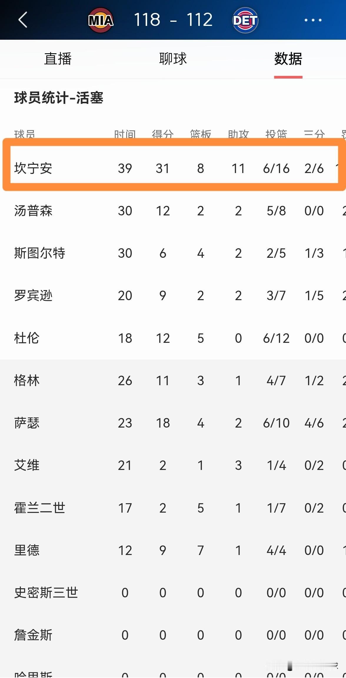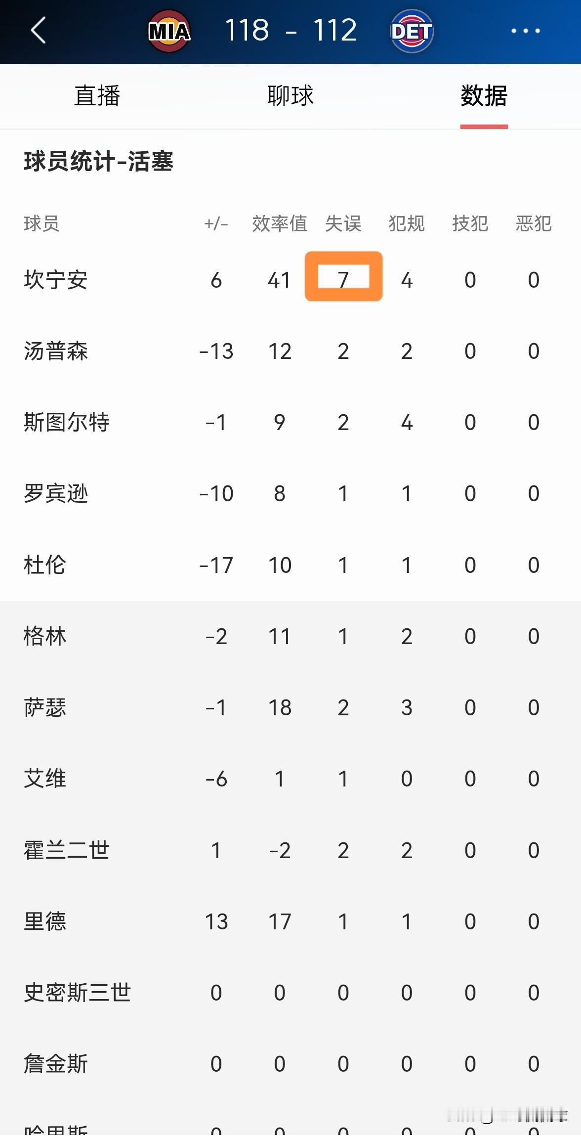 活塞当家球星康宁汉姆必须背锅了!今天活塞在主场以112:118不敌热火,此役康宁汉姆在失误端大发神威疯狂的出现了7次失误,是球队输球的罪魁祸首。 全场比赛下来,康宁汉姆首发出战39分钟,投篮16中6,其中三分球6中2、罚球18中17砍下31分8篮板11助攻7失误的准四双。 有一说一,本场比赛康宁汉姆在进攻端的表现确实非常出色,但是作为球队的绝对核心,他竟然出现7次失误,这是让人无法容忍的。