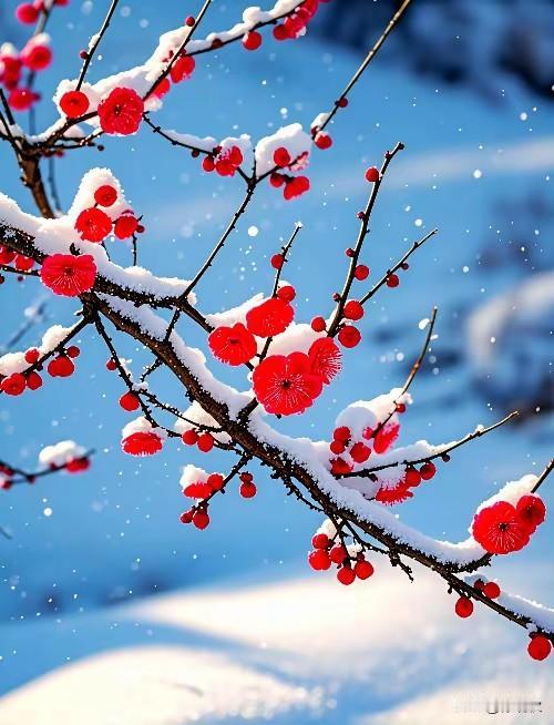 北国风光,千里冰封。 万里雪飘。 梅花欢喜漫天雪, 飘飘洒洒天上来。 玉树琼花添