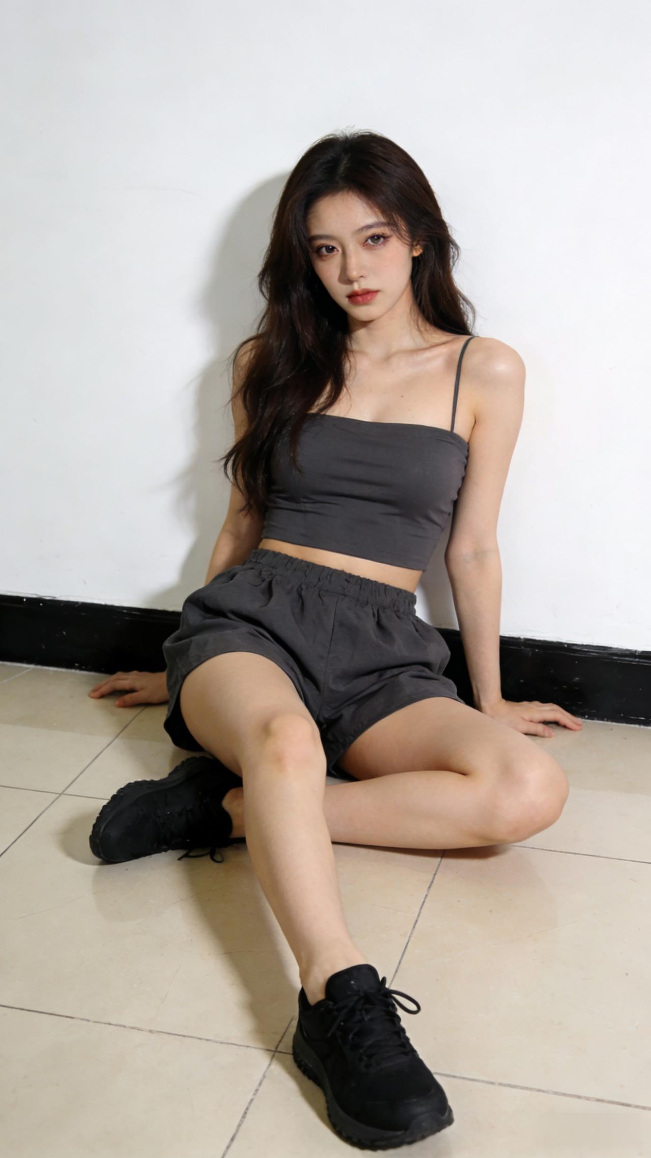 都市少女风穿搭,简约又不失时尚感,黑色运动鞋搭配灰色上衣和短裤,轻松自在。灰色短