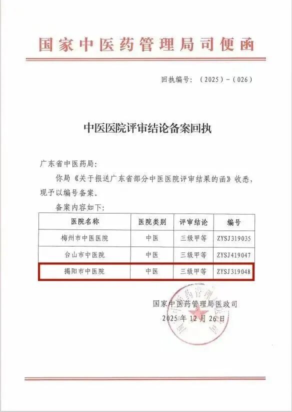 2025年12月30日,省中医药局发文确定,经资格审查、现场评审、综合评分、结果公示,市中医院成功晋升三级甲等中医医院。