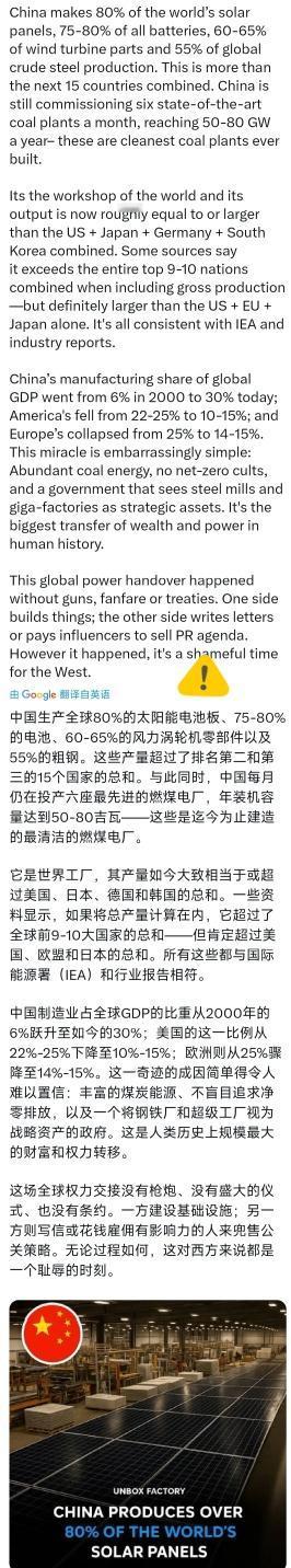 澳大利亚科学家的发文,戳破了西方最不愿承认的现实! 全球80%的太阳能电池板、75%以上的电池、过半粗钢产量,中国制造业体量硬刚美日德韩总和,这哪里是“世界工厂”,分明是全球产业的压舱石。 那些每月投产的先进燃煤电厂,早已是超低排放的“绿电厂”,绝非西方口中的“污染代名词”。 从2000年6%到如今30%的全球占比,中国的崛起从不是运气,而是不盲从“净零崇拜”,把制造业当战略资产的清醒。 这场权力转移没有硝烟,却比任何条约都震撼——一边是实打实的建造与创新,一边是靠公关话术自欺欺人。 真正的强大从不是喊出来的,而是干出来的。你觉得中国制造业接下来该往哪个方向发力,才能持续领跑全球?