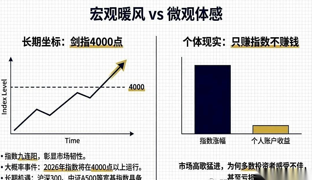 今年最魔幻的一件事儿: 看着大盘红彤彤的,打开自己账户,绿得能养鱼。 你说这叫什么事儿。 一打听,嗨,原来是那几只“天选之股”在硬扛,凭一己之力拉高了整个班的平均分。 问题是,全班就那么几个学霸啊。 剩下我们这些“气氛组”呢?陪跑的呢?连卷子都没看清,考试就结束了。 而且,你光买对还不行。 你得是在人家还没睡醒的时候,就悄悄潜伏进去了。等我们这些后知后觉的冲进去,那不叫投资,那叫山顶站岗,给人家抬轿子。 所以啊,别再跟我聊什么指数了,也别分析什么宏观大势了。 那些都是星辰大海,太遥远。 我就想知道,为啥我兜里的钢镚儿,越来越少了? 这体感,比冬天忘穿秋裤还难受。 扎心不?