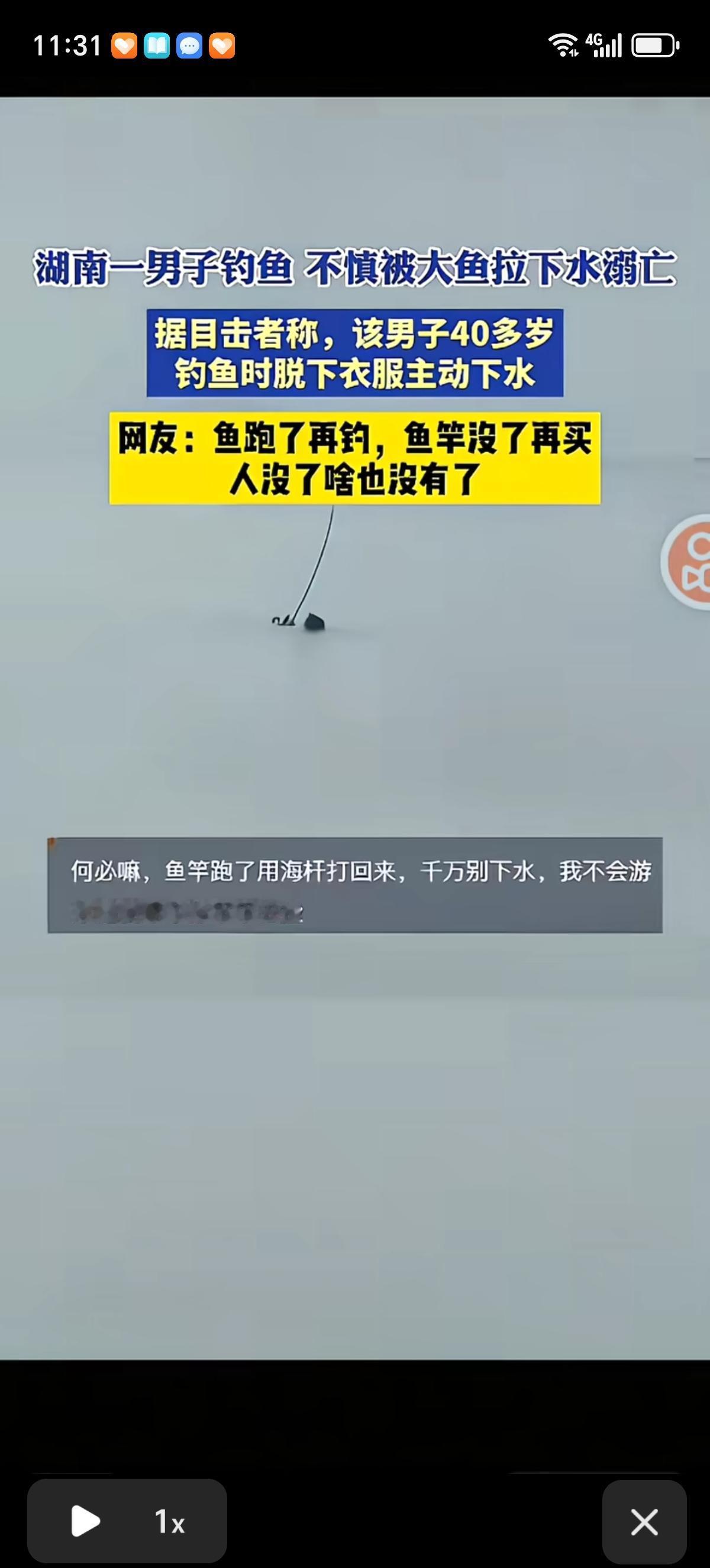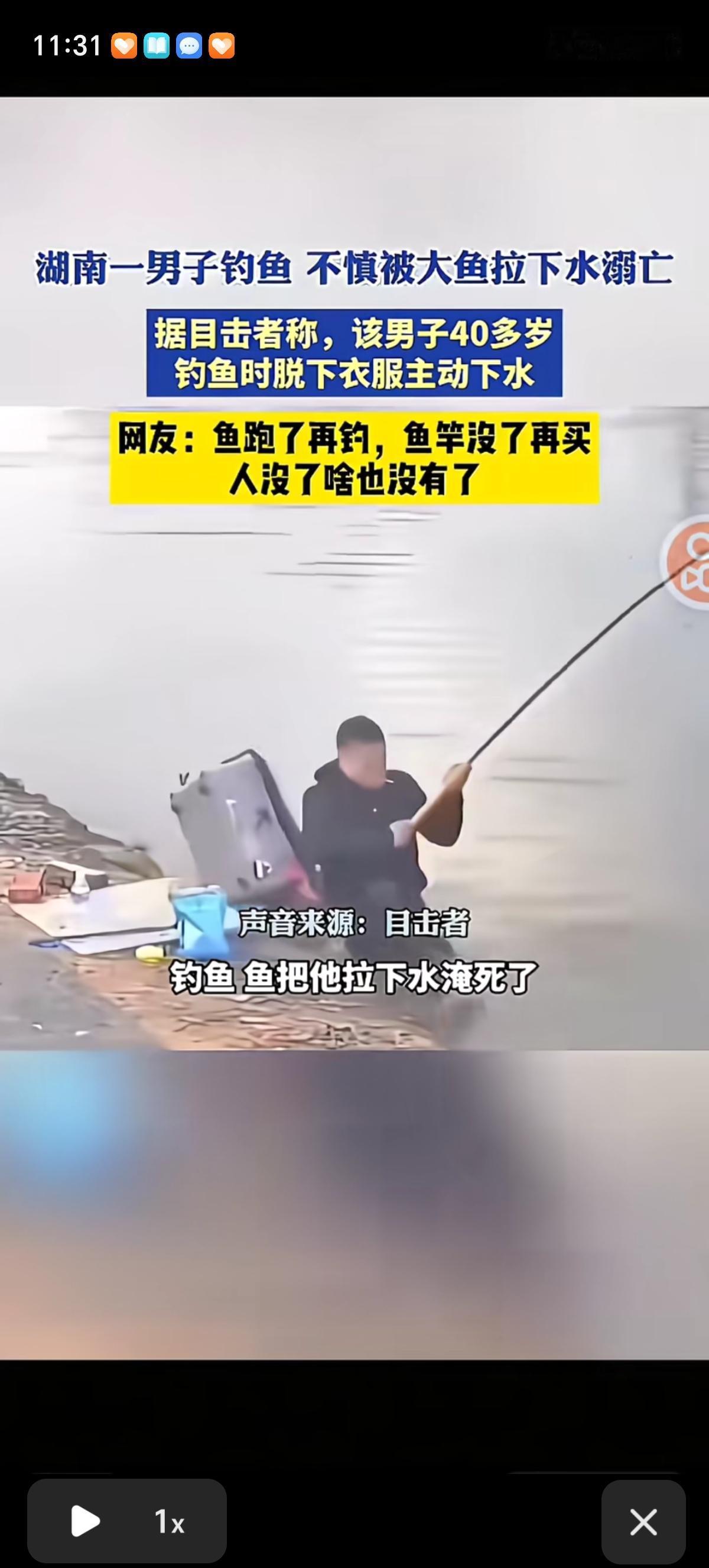 钓鱼佬对钓鱼这事是认真的,湖南一个钓鱼佬钓到了一条百来斤的大青鱼,被鱼带的滑水里去了,为了把鱼钓上来,他主动把外套脱了,顺着鱼竿的力道下水去追鱼,被鱼越带离岸边越远。 水都淹到脖子了还不放弃,鱼竿一直举着,最后人到了湖水中间,水淹到了头顶,回不来了,人到中午就淹死里边了。鱼竿一直在湖水中间举着。 这个钓鱼佬才40来岁,正是上有老下有小的年纪。有网友说年前这里就有一个这样的,因为拉不过鱼,跳下河去捡鱼竿,人就没了。 还有网友说何必嘛,鱼跑了再钓,鱼竿没了再买,人没了就啥也没有了。对此你怎么看?