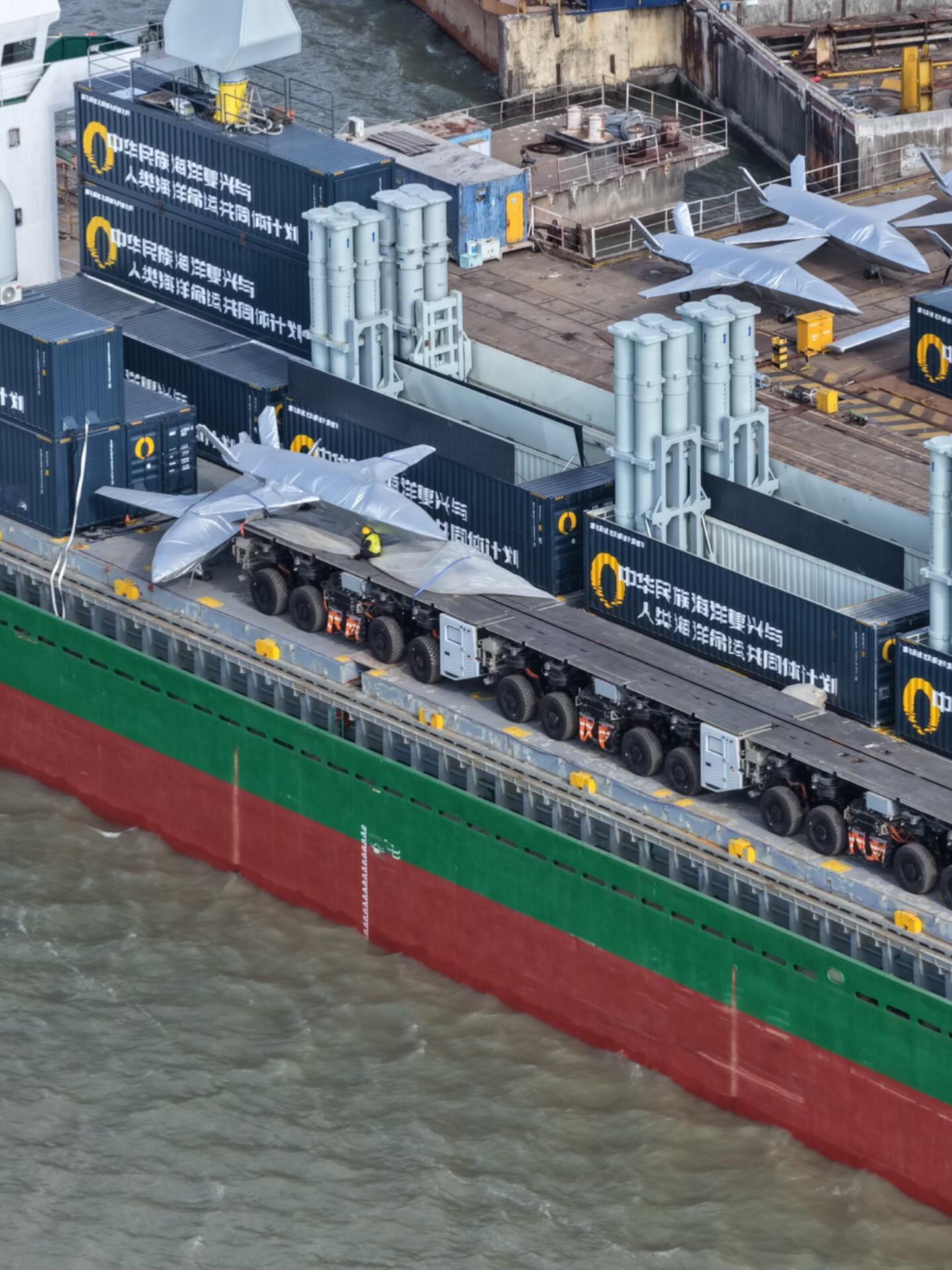 陆基 CCA 无人机弹射器装上集装箱式垂直发射系统(VLS)的船!这意味着我们的民用舰艇能够发射携带PL-15远程空空导弹的重型空中优势无人机,并能发射包括高超音速YJ-20/YJ-21导弹在内的多种导弹。