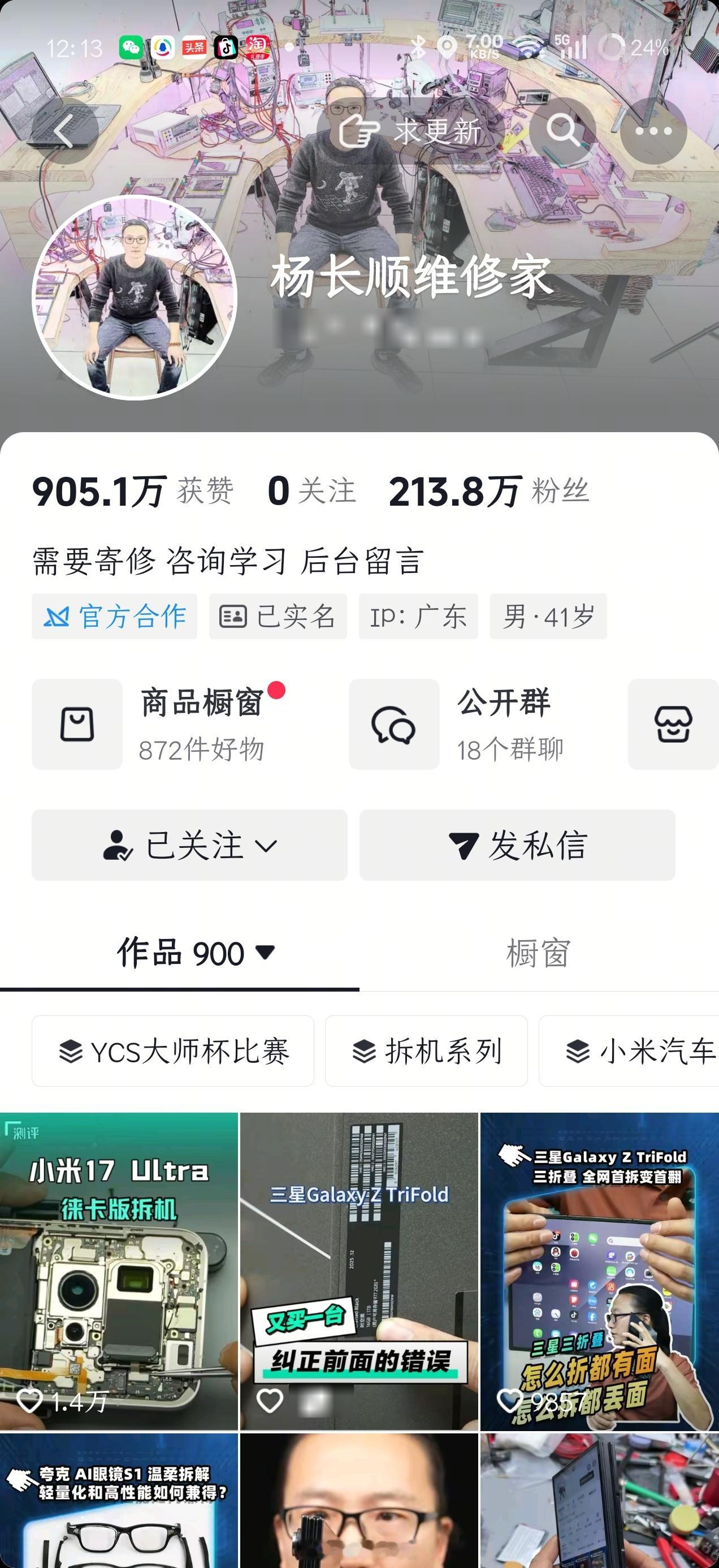 杨长顺账号正常啊,而且拆解小米17 Ultra徕卡版的视频状态也正常,怎么有人开
