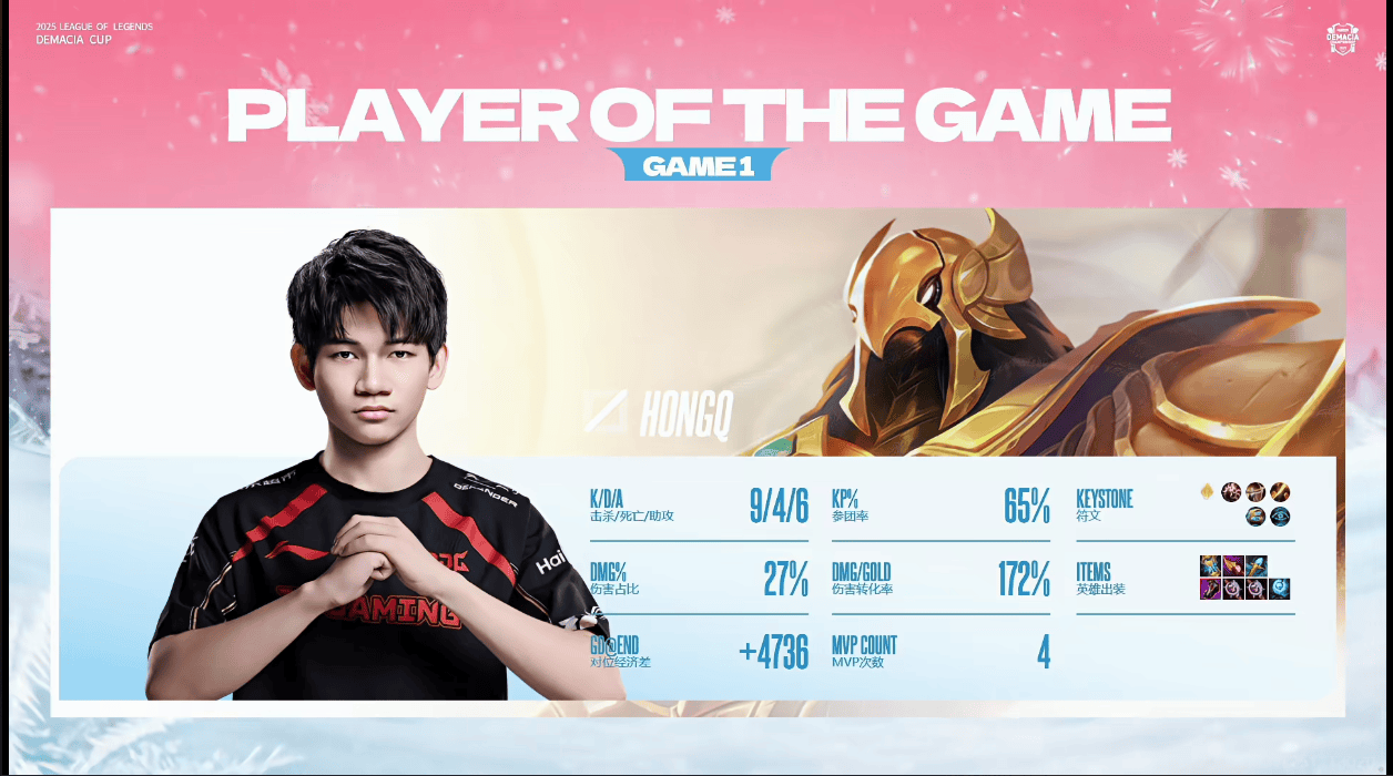 HongQ沙皇打出9/4/6战绩,斩获JDG对阵LGD第一局MVP