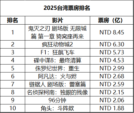 2025年第52周台湾票房 :1.《阿凡达3》蝉联冠军,累计票房2.68亿排名2025年度第6;2.《疯狂动物城2》累计票房6.3亿排名2025年度第2,台湾影史第13;3.《大濛》公映一个月势头不减,累计票房突破8000万;4.《海绵宝宝:深海大冒险》在新片中表现最佳。(单位:新台币 数据:台湾电影及视听文化中心)