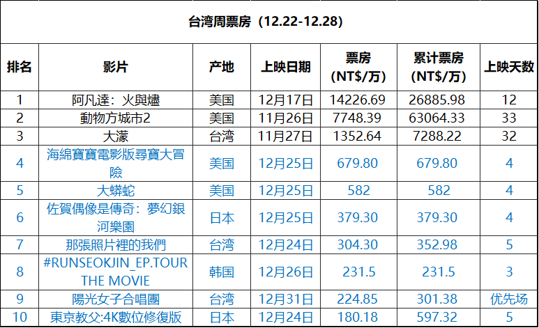 2025年第52周台湾票房 :1.《阿凡达3》蝉联冠军,累计票房2.68亿排名2
