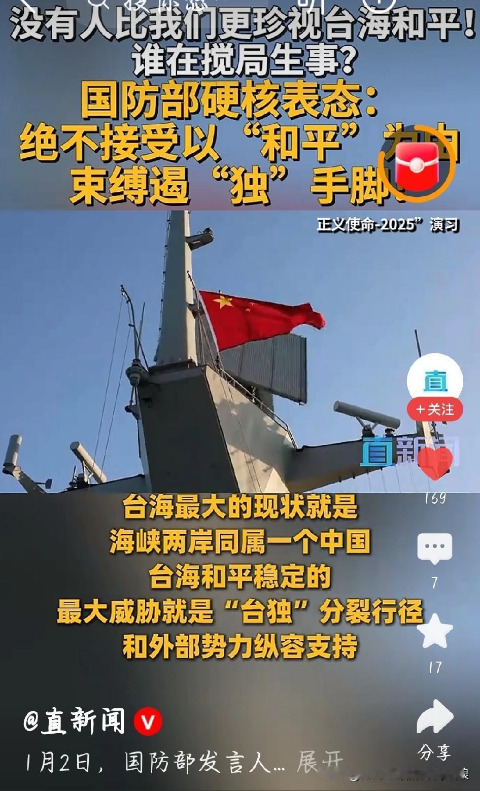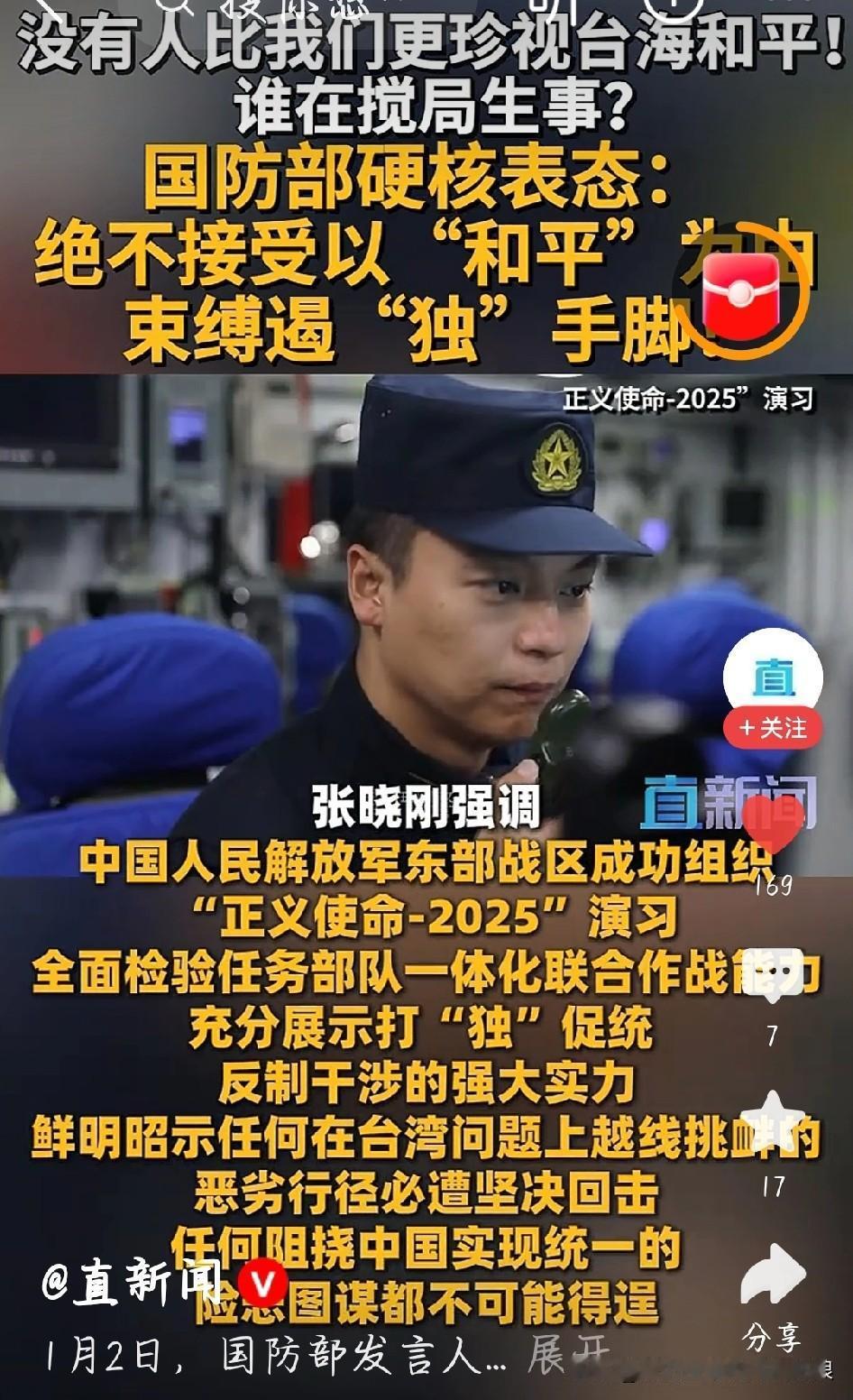 朋友们!美日澳还有欧盟这帮国家,又来对咱们的军演指手画脚了! 咱们东部战区搞“正义使命-2025”演习,本来就是针对“台独”分裂势力和外部干涉,完全是自家内政,保卫领土完整天经地义。结果他们倒好,对着“台独”勾连外部势力装瞎,反而指责咱们“破坏稳定”,简直是只许州官放火不许百姓点灯! 国防部直接硬气回应:台湾是中国的,这事轮不到外人插嘴!解放军演习正当必要,就是要警告那些搞分裂、搞干涉的。谁要是敢越线挑衅,咱们必坚决回击,绝不含糊! 真当咱们好欺负?维护国家统一的决心摆在这,任谁也挡不住!你们觉得这些国家是不是多管闲事?国防部回应美日澳等对演习说三道四 图片截图于网络