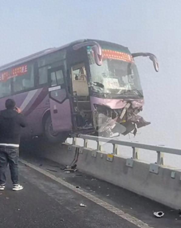 1月2日,有网友在社交平台发布视频称,河南开封一座大桥上发生多车追尾撞击事故。视频显示,现场大雾弥漫,至少有十三辆车停在马路上,多辆汽车被追尾,尾部破碎严重,地上散落破碎零件,还有一辆大客车架在围栏上,前部已经伸出桥外,车身挨着一辆大货车。有交警和民警赶到现场处理事故,还有一辆急救车驶入。