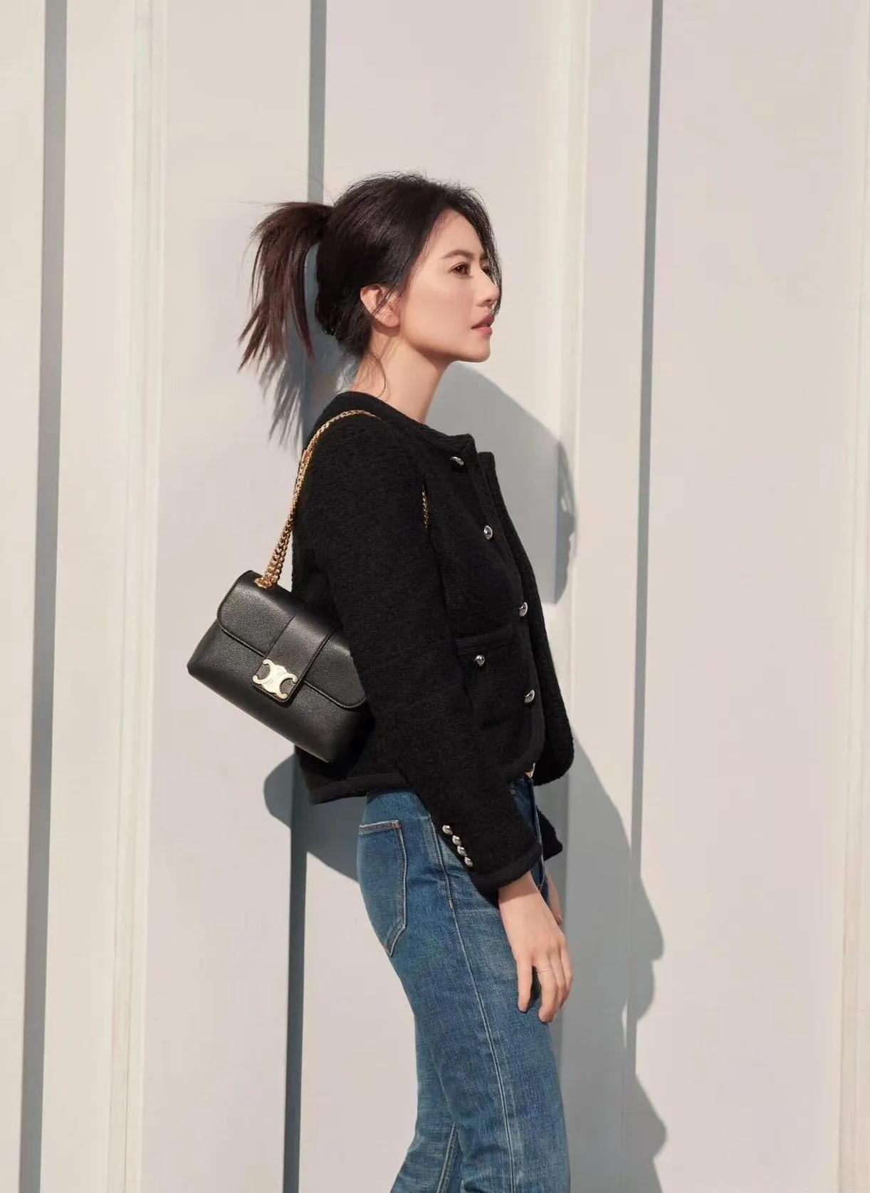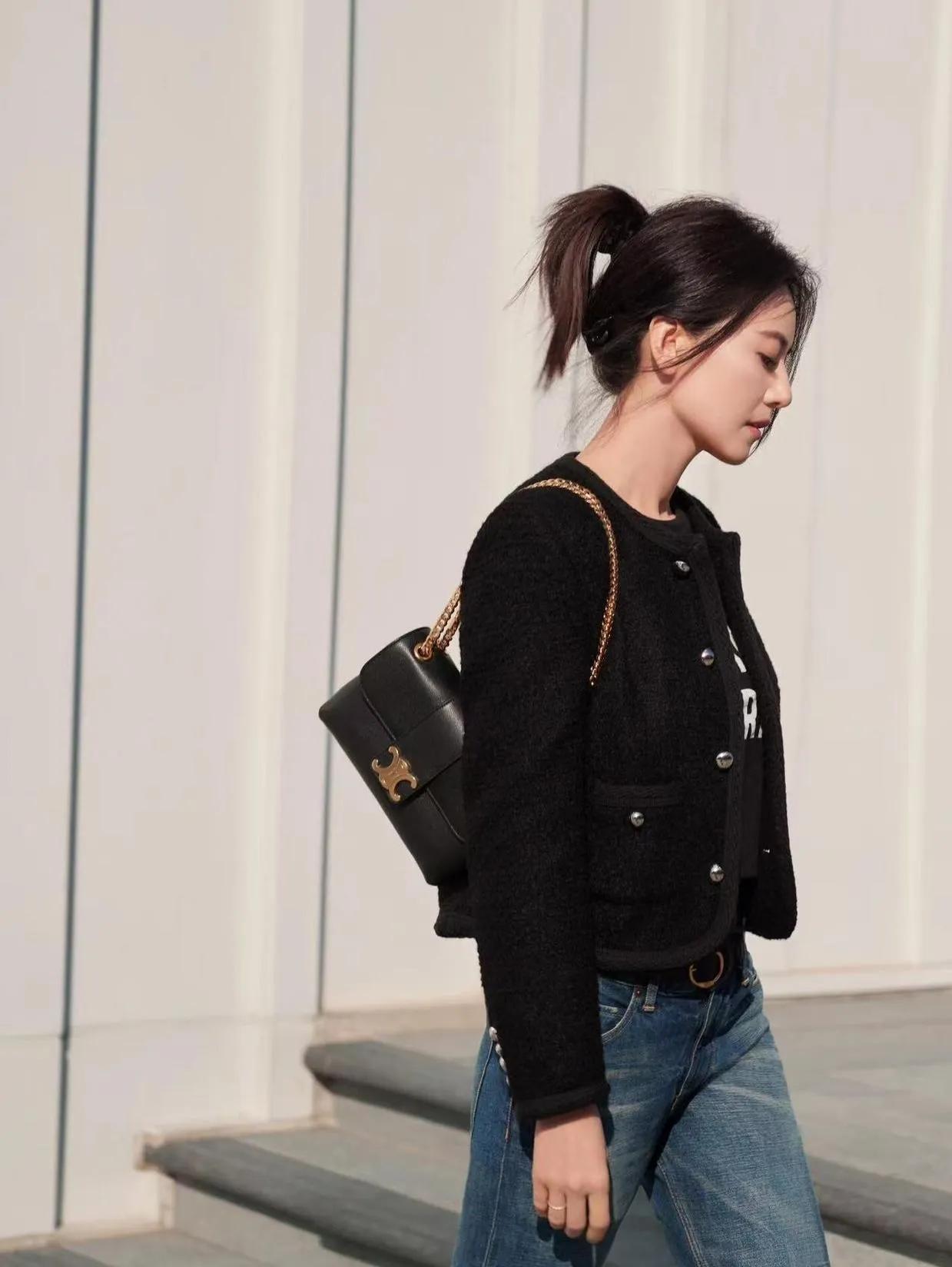 ✨ 高圆圆最新街拍,简约高级感拉满! 黑色粗花呢外套配复古牛仔裤,随性马尾+