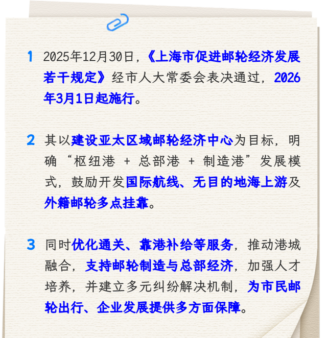 市文化旅游局介绍,《上海市促进邮轮经济发展若干规定》已由上海市第十六届人民代表大会常务委员会第二十六次会议表决通过,将自2026年3月1日起施行。具体内容详见↓