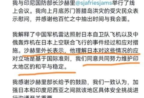 恶人先告状?小泉进次郎拿“雷达照射”事件四处求安慰,印尼国防部长沙赫里可不管这一套,仅“理解”但没说是“支持”日本的做法。 2025年12月6日,中国海军辽宁舰航母编队在宫古海峡以东公海海域开展舰载机飞行训练,事先公布了相关海空域。日本自卫队却派出F-15战斗机多次接近训练区域,干扰中方正常活动。 第二天凌晨,日本防卫大臣小泉进次郎紧急开记者会,宣称中国歼-15战斗机两次对日方战机实施雷达照射,一次几分钟,另一次间歇半小时左右。他把这说成危险举动,已向中方抗议。事实是,中方训练完全合法,开启搜索雷达属于标准操作,确保安全而已。日方飞机抵近滋扰,才是制造风险的源头。 中方很快回应,中国海军发言人指出,日方说法与事实不符,要求停止抹黑,约束一线行动。中国外交部也多次表态,事件关键在于日方战机闯入演训区,抵近侦察干扰,还倒打一耙,炒作话题,误导舆论。 小泉进次郎不死心,继续到处拉人站队。先是12月12日跟美国国防部长通话,高调宣传双方对事件表达关切。美国那边新闻稿只泛泛提了中国军事活动,没细说支持日方版本。小泉还发社交媒体照片,摆两国国旗,装严肃打电话,日本网友一看就说摆拍明显,记事本空空如也,国旗位置太刻意,评论区一片嘲笑。 他还试图找其他国家帮忙,拉盟友声援。印尼那边,普拉博沃总统早就重申坚持一个中国原则。小泉进次郎跑去跟印尼国防部长沙赫里视频会谈,详细讲事件细节,传达日方关切。沙赫里听完只说理解日方立场,没表态支持日本做法,没加入指责行列。这态度已经很清楚,日本想把印尼拉进自己的阵营,没门儿。 说白了,这事责任不在中方。中方正常训练,还提前通报,日方飞机非要凑上来,挨了雷达扫描就大喊大叫。开启雷达就是各国军机常态,没啥稀奇。日方这么折腾,一是为转移国内对首相高市早苗涉台湾地区言论的压力,二是借机渲染紧张,找借口扩军。 事件后,中方外交部反复强调,日方颠倒黑白,别有用心,已提出严正交涉。小泉进次郎在记者会上继续辩解,说日方行动正当,雷达照射才是问题。但他前后说法有矛盾,先说没收到通报,后来承认收到但细节不够,国内舆论批评不少。 美国回应低调,只说不利于地区稳定,没跟日本一起高调。其他国家大多沉默,没被带节奏。事件没升级,中日关系本来就因台湾地区问题紧张,继续这么拉锯下去。 这波操作,日本没捞到便宜,反倒让大家看清谁在制造事端。地区和平稳定,还得靠大家遵守规则,别总挑事。
