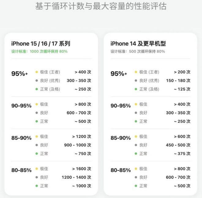 网上查询到,苹果对电池有明确的设计标准,iPhone14及以前的机型,500次完整充电循环后还能保留80%以上容量;iPhone15系列更耐用,1000次循环后健康度还能稳住80%。